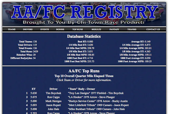 Curious as to just how many Nostalgia Funny Cars are in existence? How many different body styles are currently in use? What the quickest and fastest runs to date are and by whom? Or who won last months Nitro Blast in Cordova, Ill.? The AA/FC Registry, one of the best and certainly most well-kept drag racing registries available to the public, answers each of those questions and more with a wealth of statistics all updated on a regular basis by Boyungs in his spare time.