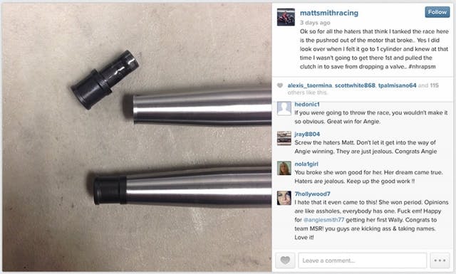 In his post-run interview at the top end, Matt indicated that he put the bike into high gear and it shut off, mentioning the fact that he’d been having rocker arm issues with his motor throughout the weekend but wasn’t sure what went wrong with the bike. On Monday, he set out to curtail the negative attention that final round has gotten via Instagram, with a photo showing the metal tip on one of the pushrods out of his engine broken off.