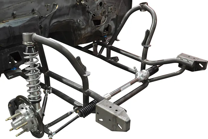 Included in the kit is the frame clip, a pair of double-adjustable VariStruts, and tubular control arms with chromoly rod ends. Also part of the system is a billet-aluminum drag race steering rack that’s been designed to have extra travel for a sharper turning radius (helpful in tight pit areas), rack clamps, and bumpsteer adjustable tie rod ends to get the steering angles correct. That’s not it — the company even provides a complete brake kit with billet hubs, lightweight rotors, and aluminum calipers.