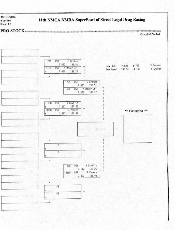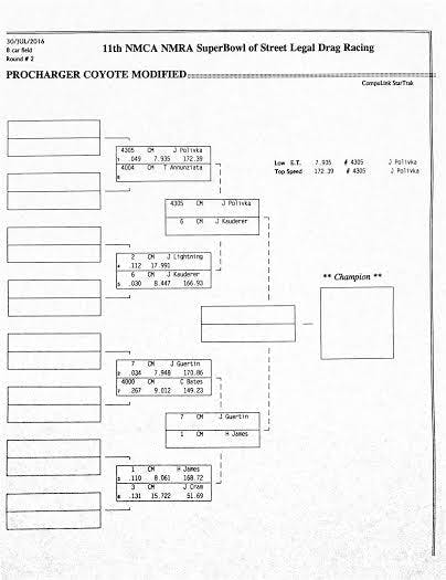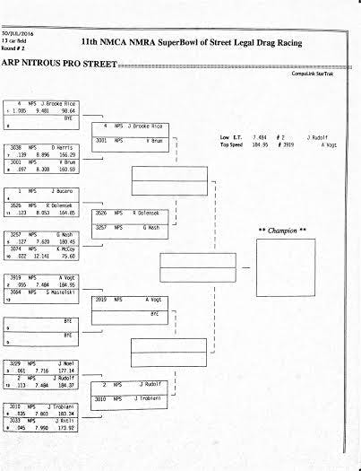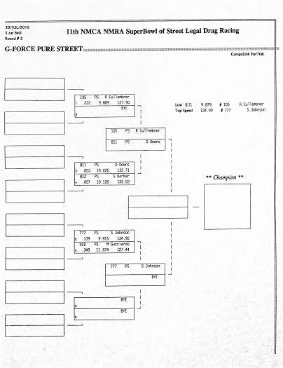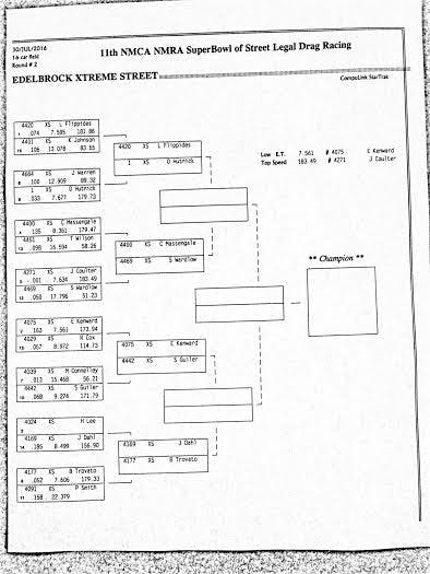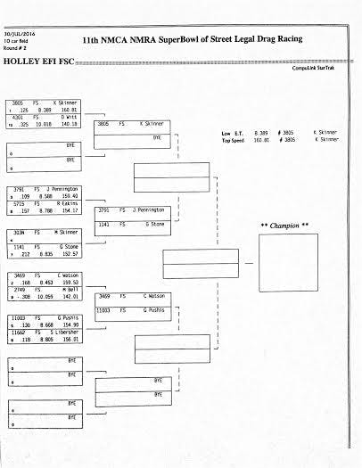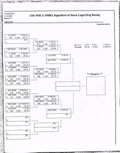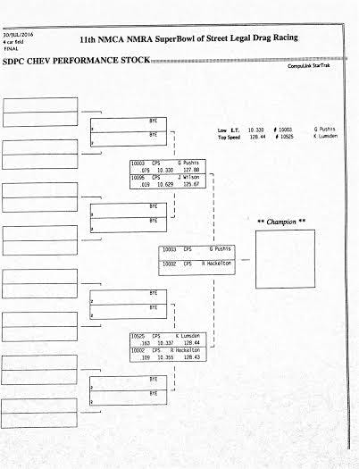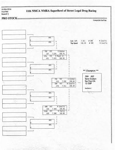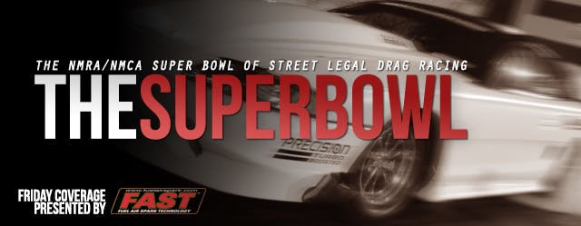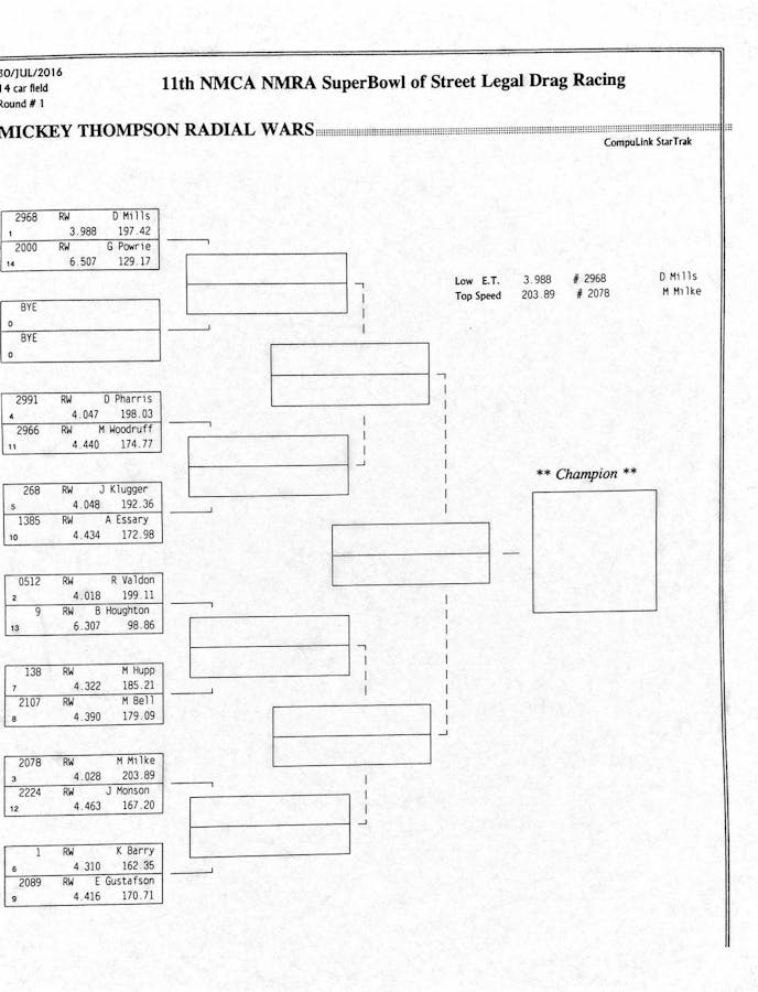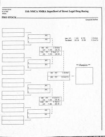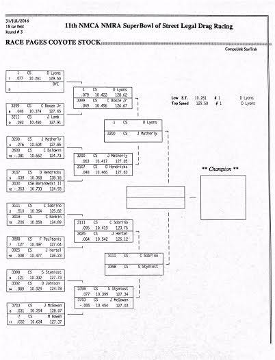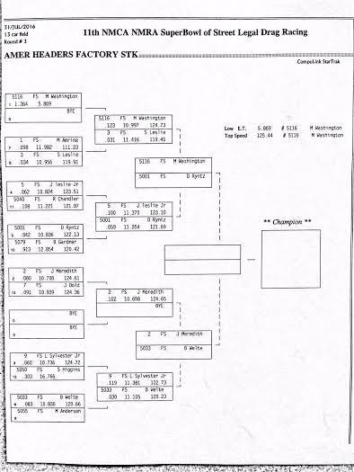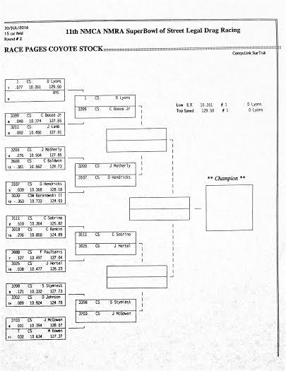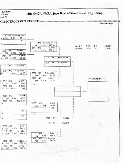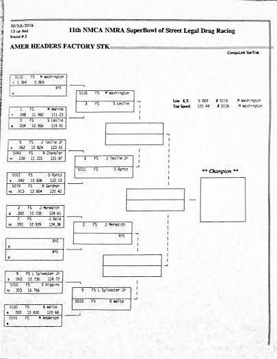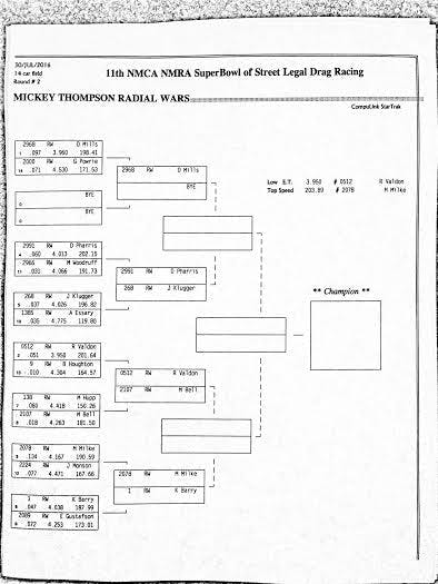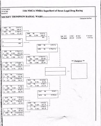 Kevin Fiscus met with Tim Savelle in the final of Xtreme Pro Mod running a 3.84 at 209 to Savelle’s 3.86 at 200 MPH. That was Fiscus’ best MPH of the weekend when he needed it after struggling early in qualifying and not getting a solid pass for any data in eliminations. In the Superbowl Showdown Kevin played a part in setting up the NMCA win.Mark Micke and Dewayne Mills met in the Radial Wars final with Mills going in with lane choice. It was a close match with Micke improving slightly over his semi final performance but was not enough to get by Mills’ who ran identical ET to his semi final run scoring a 3.973 at 198.58 to Micke’s 4.05 at 200.98 MPH.Phil Hines met up with Jackie McCarty in the Street Outlaw final but stumbled at the hit allowing McCarty to get out front and stay there with a 4.456 at 169.15 to Hines ‘4.55 at 165.66 MPH run.Steve Graham earned a hole shot win over Nino Cavallo in an all Dodge Avenger final. Graham nailed an .012 reaction to Cavallos .070, 7.011 at 196.39 to Graham’s winning 7.032 at 196.04.In the MX235 final it would be Brad Medlock vs Brian Edwards. Both cars left together but Edwards lost traction early while Medlock went straight down to a 4.72 at 154 to earn the event win.The Xtreme Street final would be a turbo vs Procharger match with Eric Kenward and Louie Filippedas with Filippedas having lane choice. He took the left lane which turned the match in his favor as Kenward struck the tires at the hit knowing he need to improve his performance to a mid 7.50 to be in the game. Filippedas went on to win with a 7.57 at 184 MPH.In NA 10.5 the final would pit Dwight Ausmus against Mike DeMayo with both racers very tough competitors. DeMayo would be the victor today scoring a 7.98 at 169.17 to Ausmus’ game 8.06 at 196.32 for the Pontiac powered Firebird.Factory stock pit Dan Ryntz and James Meredith against each other with Ryntz getting the advantage at the tree. His 10.92 at 120 was not enough to hold off Meredith who laid down a 10.76 at 124 to earn the event win.Adam Arndt and Aaron Bates met in the Renegade final round with Bates taking the holeshot and the win with a 7.55 at 183 to Arndt’s game 7.62 at 180.The Coyote Stock final had Tim Matherly against “Shiftin”Shane Stymiest with Matherly taking the starting line advantage. At the finish line it would be Matherly with the win with a 10.45 at 126 MPH over the Stymiest who was quicker with a 10.41 at 126.The Street Outlaw final paired Jacky McCarty and Charles Hull who had lane choice choosing the left side. It was fairly even at the line and side by side down track with McCarty scoring the win in a very tight match with a 4.436 at 167.47 to Hull’s very close 4.438 at 172.14 MPH. They would face each other again in the Superbowl with the same outcome.Radial Wars racer Dewayne Mills sealed the deal for the NMCA Superbowl win this weekend scoring a 3.85 at 206 MPH. The NMRA was ahead in the race for the rings but Kevin Fiscus and Jacky McCarty did their part winning their races setting up a make or break final pass with Mills and Aaron Bates who put up a 4.85 at 147.