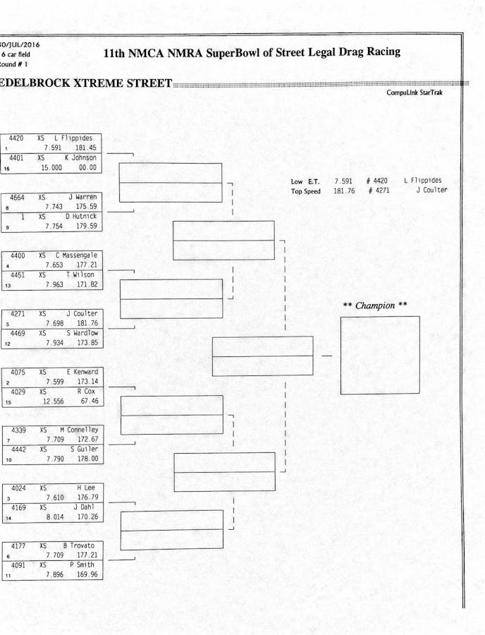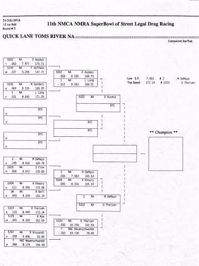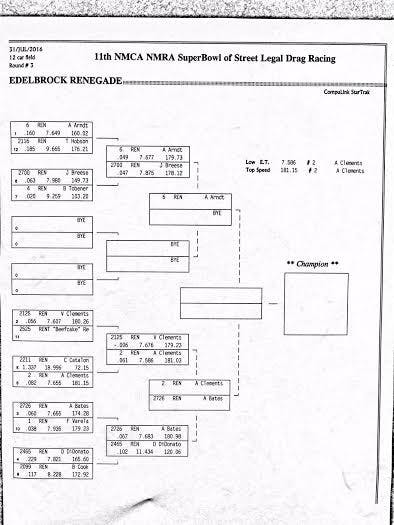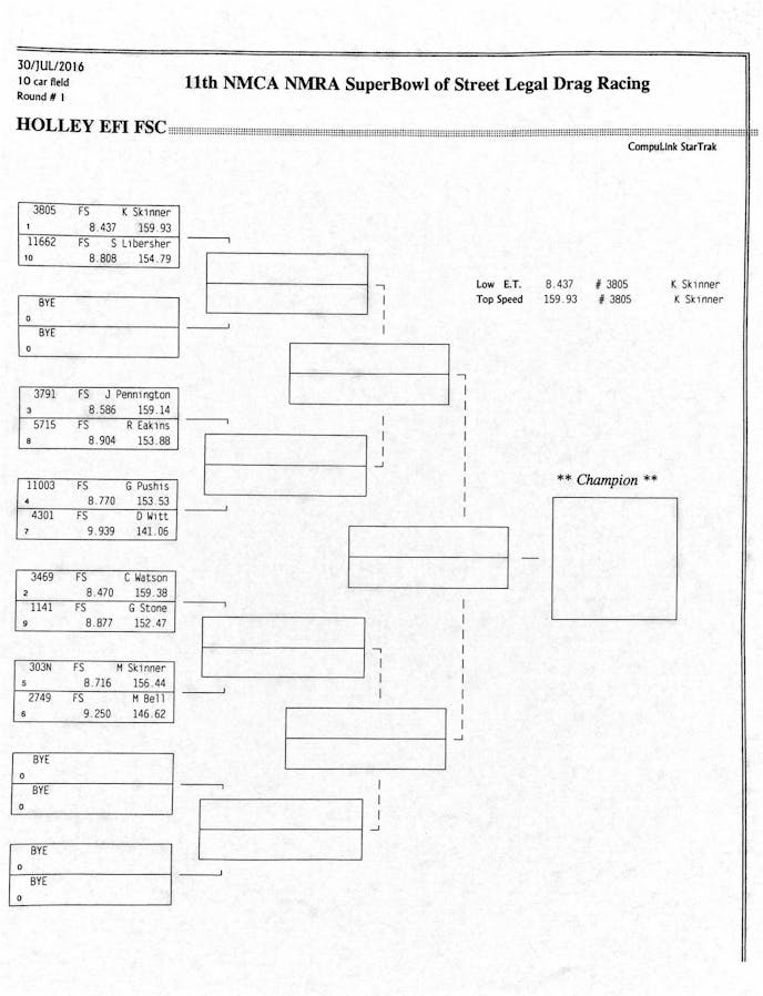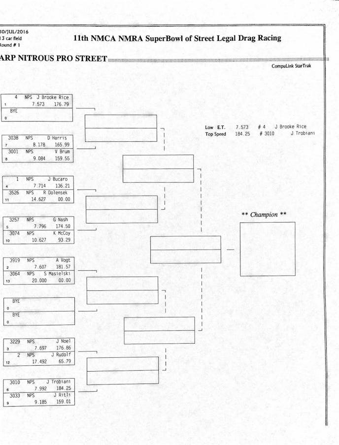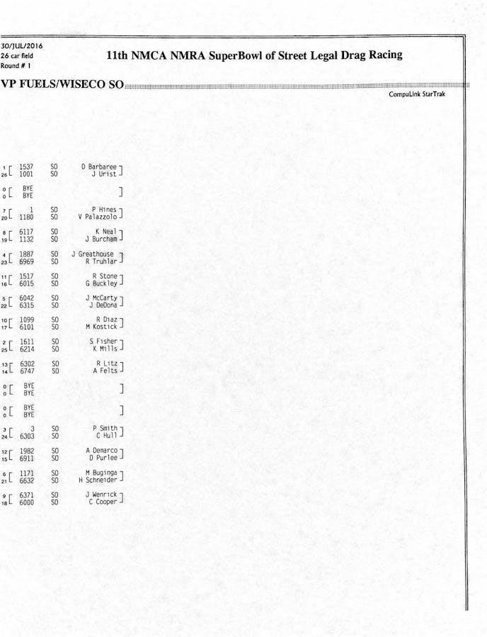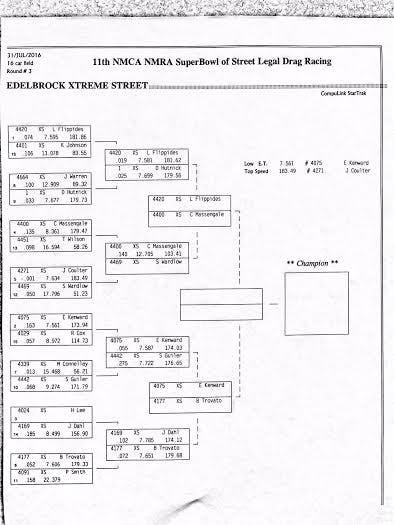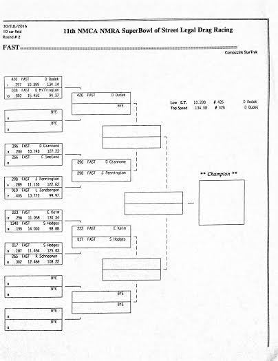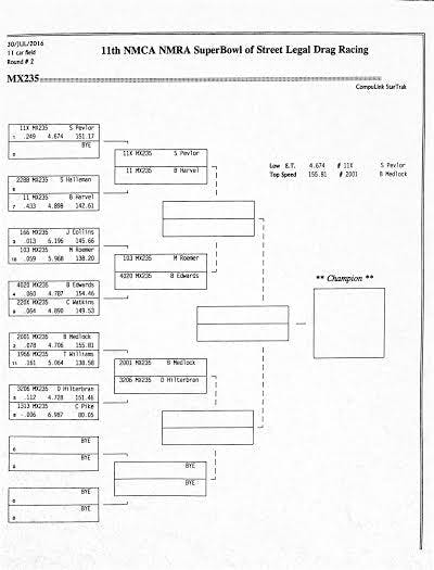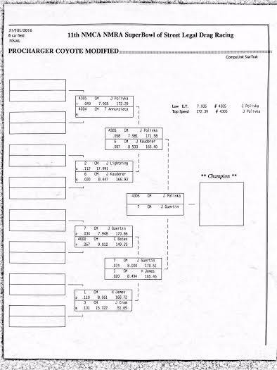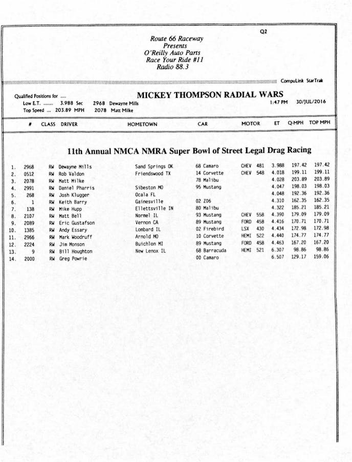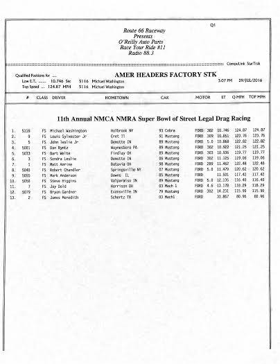 Kevin Fiscus met with Tim Savelle in the final of Xtreme Pro Mod running a 3.84 at 209 to Savelle’s 3.86 at 200 MPH. That was Fiscus’ best MPH of the weekend when he needed it after struggling early in qualifying and not getting a solid pass for any data in eliminations. In the Superbowl Showdown Kevin played a part in setting up the NMCA win.Mark Micke and Dewayne Mills met in the Radial Wars final with Mills going in with lane choice. It was a close match with Micke improving slightly over his semi final performance but was not enough to get by Mills’ who ran identical ET to his semi final run scoring a 3.973 at 198.58 to Micke’s 4.05 at 200.98 MPH.Phil Hines met up with Jackie McCarty in the Street Outlaw final but stumbled at the hit allowing McCarty to get out front and stay there with a 4.456 at 169.15 to Hines ‘4.55 at 165.66 MPH run.Steve Graham earned a hole shot win over Nino Cavallo in an all Dodge Avenger final. Graham nailed an .012 reaction to Cavallos .070, 7.011 at 196.39 to Graham’s winning 7.032 at 196.04.In the MX235 final it would be Brad Medlock vs Brian Edwards. Both cars left together but Edwards lost traction early while Medlock went straight down to a 4.72 at 154 to earn the event win.The Xtreme Street final would be a turbo vs Procharger match with Eric Kenward and Louie Filippedas with Filippedas having lane choice. He took the left lane which turned the match in his favor as Kenward struck the tires at the hit knowing he need to improve his performance to a mid 7.50 to be in the game. Filippedas went on to win with a 7.57 at 184 MPH.In NA 10.5 the final would pit Dwight Ausmus against Mike DeMayo with both racers very tough competitors. DeMayo would be the victor today scoring a 7.98 at 169.17 to Ausmus’ game 8.06 at 196.32 for the Pontiac powered Firebird.Factory stock pit Dan Ryntz and James Meredith against each other with Ryntz getting the advantage at the tree. His 10.92 at 120 was not enough to hold off Meredith who laid down a 10.76 at 124 to earn the event win.Adam Arndt and Aaron Bates met in the Renegade final round with Bates taking the holeshot and the win with a 7.55 at 183 to Arndt’s game 7.62 at 180.The Coyote Stock final had Tim Matherly against “Shiftin”Shane Stymiest with Matherly taking the starting line advantage. At the finish line it would be Matherly with the win with a 10.45 at 126 MPH over the Stymiest who was quicker with a 10.41 at 126.The Street Outlaw final paired Jacky McCarty and Charles Hull who had lane choice choosing the left side. It was fairly even at the line and side by side down track with McCarty scoring the win in a very tight match with a 4.436 at 167.47 to Hull’s very close 4.438 at 172.14 MPH. They would face each other again in the Superbowl with the same outcome.Radial Wars racer Dewayne Mills sealed the deal for the NMCA Superbowl win this weekend scoring a 3.85 at 206 MPH. The NMRA was ahead in the race for the rings but Kevin Fiscus and Jacky McCarty did their part winning their races setting up a make or break final pass with Mills and Aaron Bates who put up a 4.85 at 147.