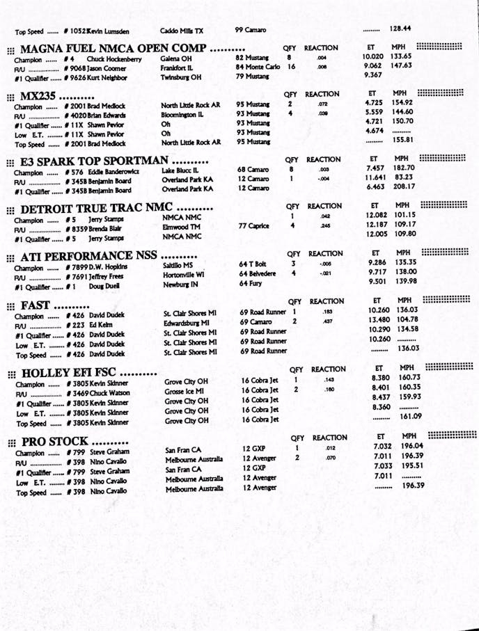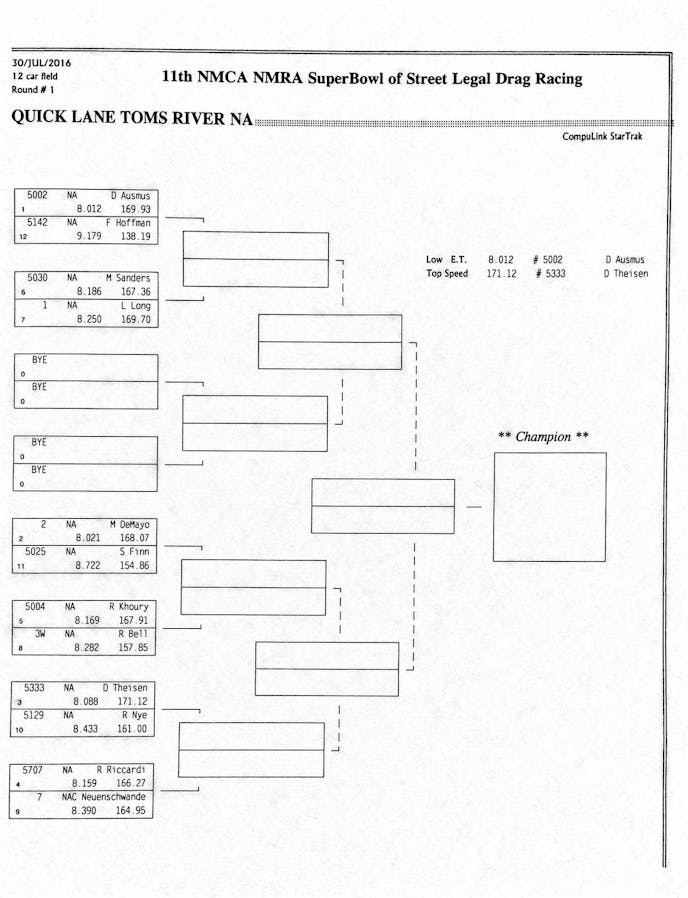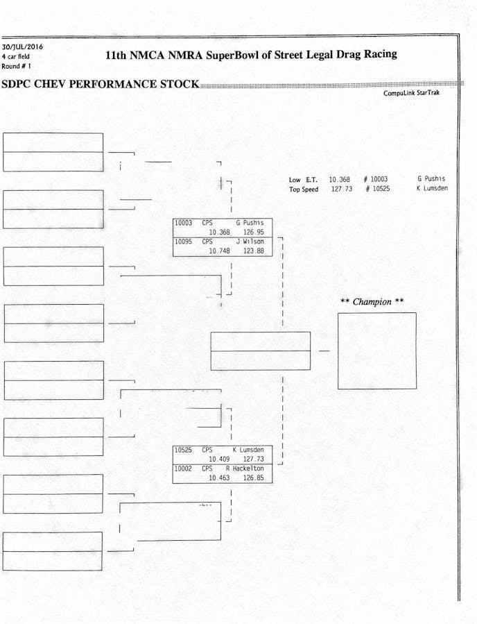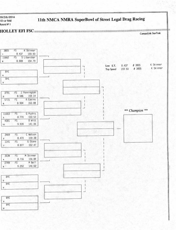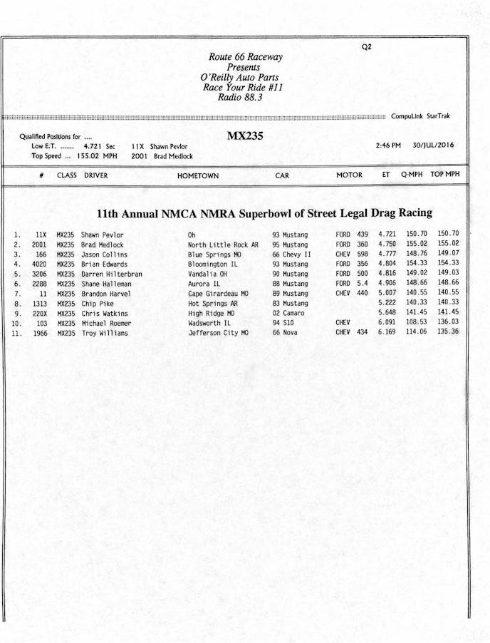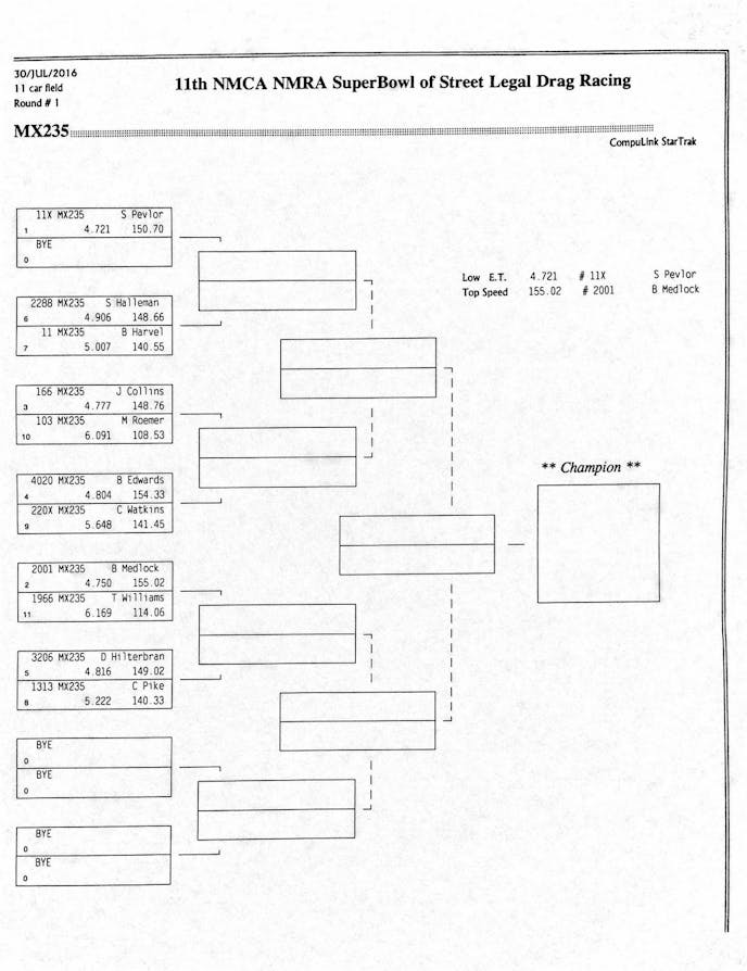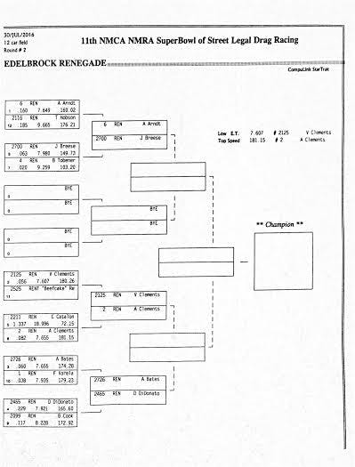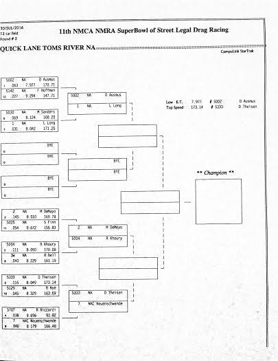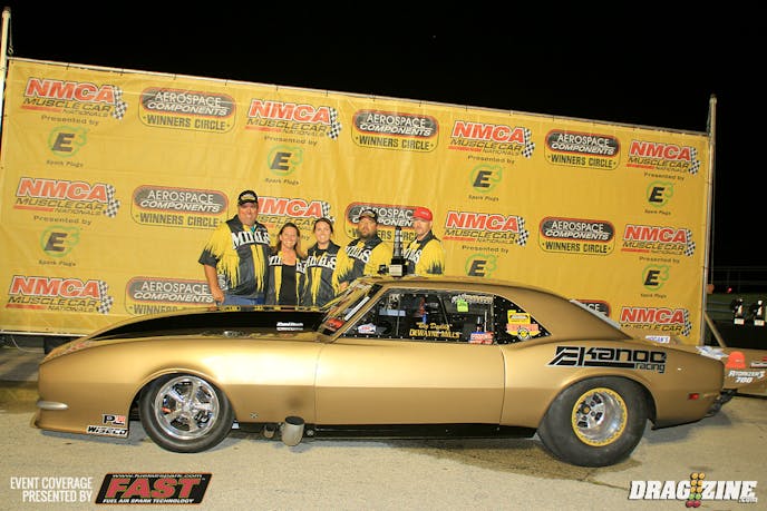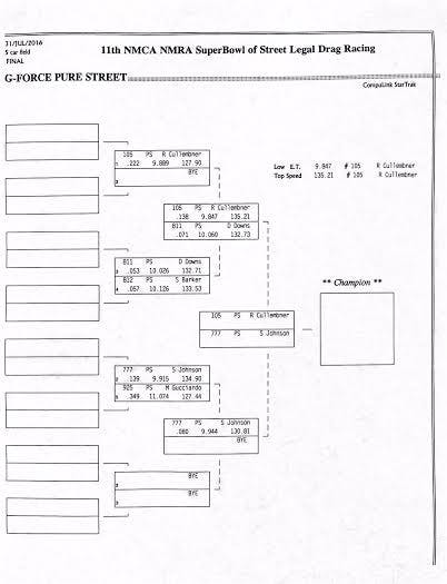 Kevin Fiscus met with Tim Savelle in the final of Xtreme Pro Mod running a 3.84 at 209 to Savelle’s 3.86 at 200 MPH. That was Fiscus’ best MPH of the weekend when he needed it after struggling early in qualifying and not getting a solid pass for any data in eliminations. In the Superbowl Showdown Kevin played a part in setting up the NMCA win.Mark Micke and Dewayne Mills met in the Radial Wars final with Mills going in with lane choice. It was a close match with Micke improving slightly over his semi final performance but was not enough to get by Mills’ who ran identical ET to his semi final run scoring a 3.973 at 198.58 to Micke’s 4.05 at 200.98 MPH.Phil Hines met up with Jackie McCarty in the Street Outlaw final but stumbled at the hit allowing McCarty to get out front and stay there with a 4.456 at 169.15 to Hines ‘4.55 at 165.66 MPH run.Steve Graham earned a hole shot win over Nino Cavallo in an all Dodge Avenger final. Graham nailed an .012 reaction to Cavallos .070, 7.011 at 196.39 to Graham’s winning 7.032 at 196.04.In the MX235 final it would be Brad Medlock vs Brian Edwards. Both cars left together but Edwards lost traction early while Medlock went straight down to a 4.72 at 154 to earn the event win.The Xtreme Street final would be a turbo vs Procharger match with Eric Kenward and Louie Filippedas with Filippedas having lane choice. He took the left lane which turned the match in his favor as Kenward struck the tires at the hit knowing he need to improve his performance to a mid 7.50 to be in the game. Filippedas went on to win with a 7.57 at 184 MPH.In NA 10.5 the final would pit Dwight Ausmus against Mike DeMayo with both racers very tough competitors. DeMayo would be the victor today scoring a 7.98 at 169.17 to Ausmus’ game 8.06 at 196.32 for the Pontiac powered Firebird.Factory stock pit Dan Ryntz and James Meredith against each other with Ryntz getting the advantage at the tree. His 10.92 at 120 was not enough to hold off Meredith who laid down a 10.76 at 124 to earn the event win.Adam Arndt and Aaron Bates met in the Renegade final round with Bates taking the holeshot and the win with a 7.55 at 183 to Arndt’s game 7.62 at 180.The Coyote Stock final had Tim Matherly against “Shiftin”Shane Stymiest with Matherly taking the starting line advantage. At the finish line it would be Matherly with the win with a 10.45 at 126 MPH over the Stymiest who was quicker with a 10.41 at 126.The Street Outlaw final paired Jacky McCarty and Charles Hull who had lane choice choosing the left side. It was fairly even at the line and side by side down track with McCarty scoring the win in a very tight match with a 4.436 at 167.47 to Hull’s very close 4.438 at 172.14 MPH. They would face each other again in the Superbowl with the same outcome.Radial Wars racer Dewayne Mills sealed the deal for the NMCA Superbowl win this weekend scoring a 3.85 at 206 MPH. The NMRA was ahead in the race for the rings but Kevin Fiscus and Jacky McCarty did their part winning their races setting up a make or break final pass with Mills and Aaron Bates who put up a 4.85 at 147.