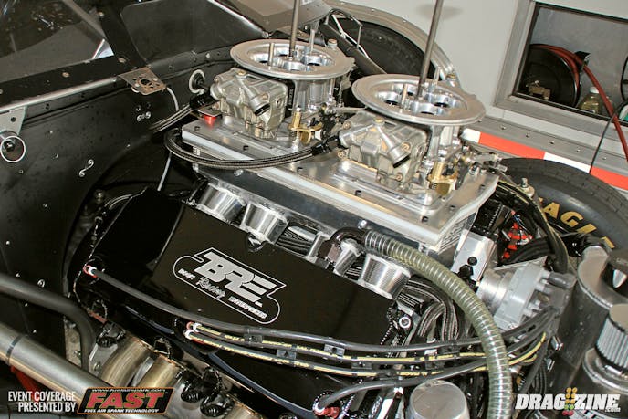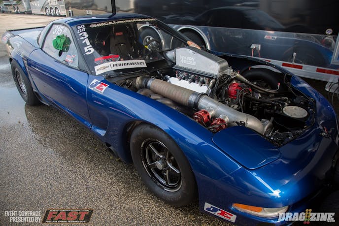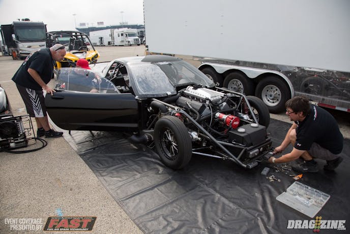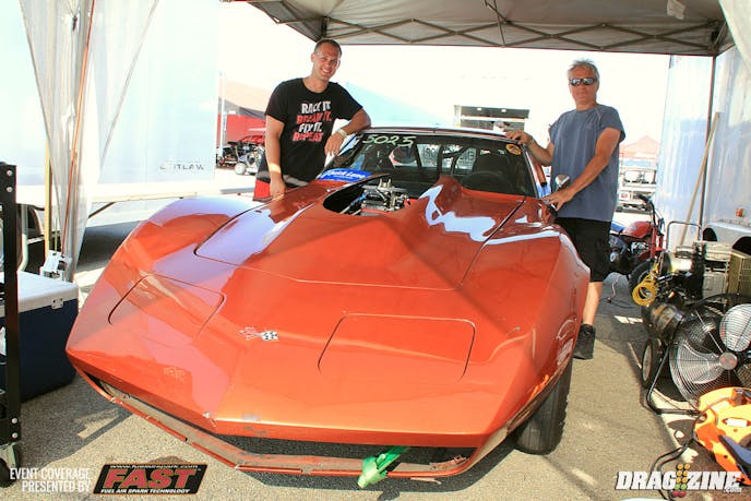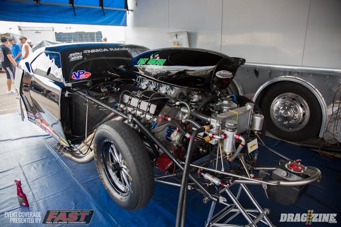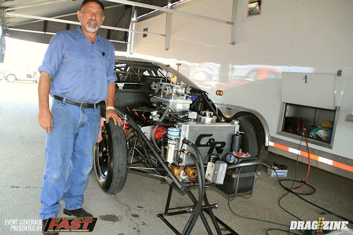 For something a little different we stopped and talked to Ryan Bell running this Corvette in NA 10.5 with an SB2 small Chevy based out of Brooklyn, NY. The rear suspension is a custom leaf spring set up with Cal Tracks and all the chassis work done in house by Ryan. This is the teams first race and they plan to run other events getting a feel for the class and is looking to upgrade the car and engine and come back for a full season next year if everything works out. We stopped by Mike DeMayo’s pit and caught up with Mike and Gabby Labiosa while they were swapping the carburetor. He sits second in class today with an 8.02 at 168, is last years champion and is second in points this year so far. Things are going well for Team Powerhead.