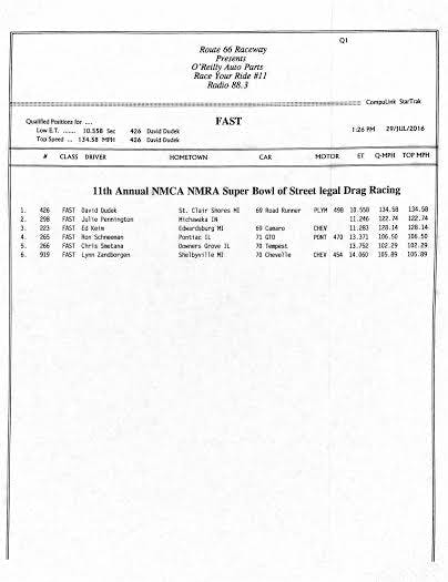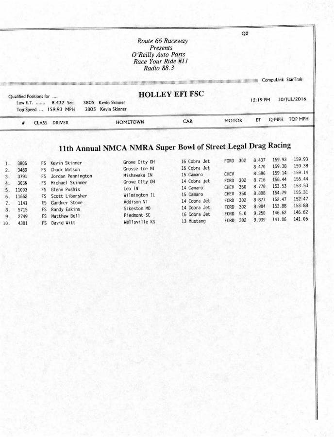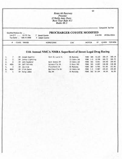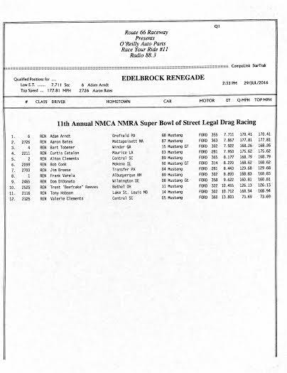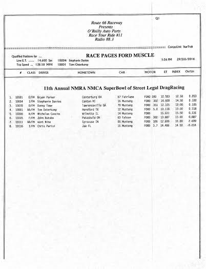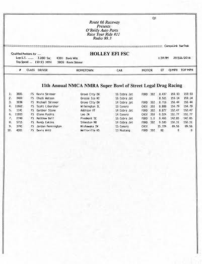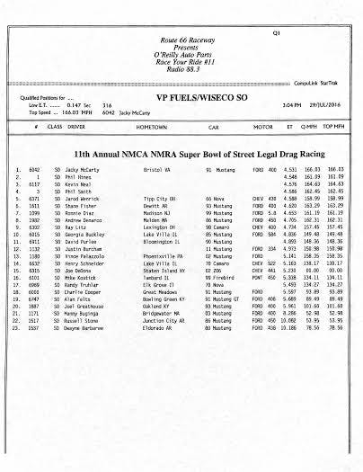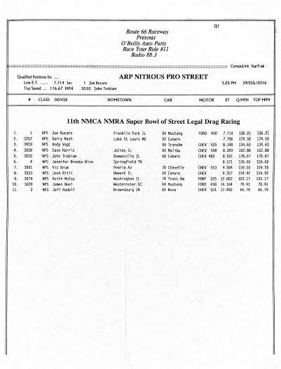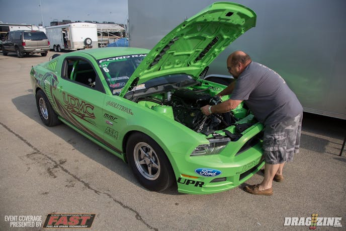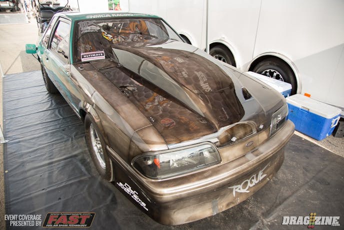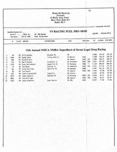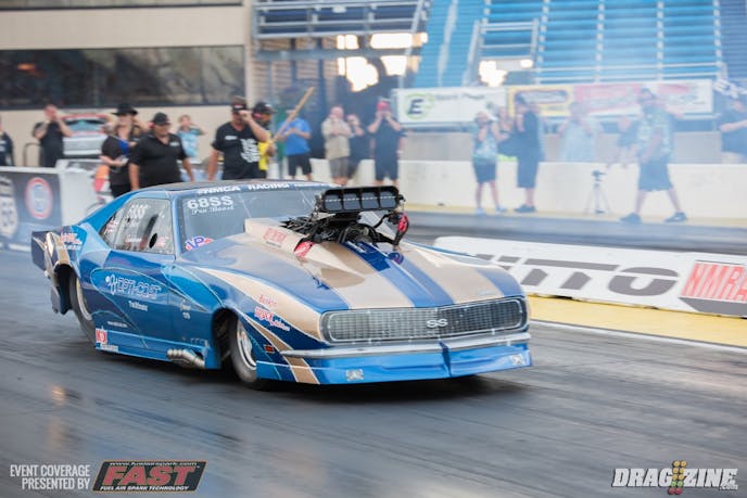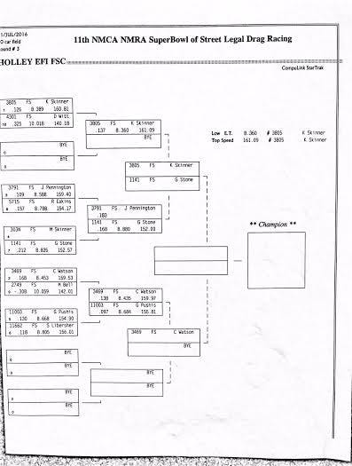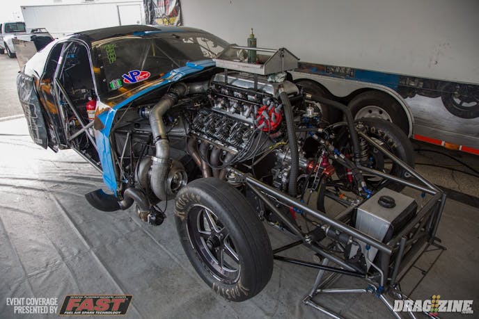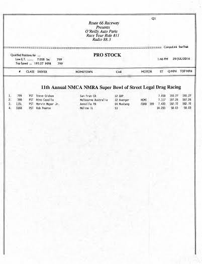 This years Route 66 NMRA/NMCA Super Bowl has three new classes this year including Pro Stock which is the second race for the class this year and was prompted by Richard Maskin and Bob Book along with Dave W using 400 cubic in limited small blocks loosely based on Australian Pro Stock rules and including an 11,000 RPM limit. Bob has one of his small block Chrysler Hemi engines in Steve Graham's GXP who is here to help support the class and it's destined for long time racer Robbie Blankenship who will be competing in the class in 2017. The rules allow EFI and engine swapping between brands so racers are not bound by car make with the hopes of drawing cars from the Comp Eliminator ranks of different body styles, not just the late models. Other well known racers including Don Bowles and Don Baskin are also rumored to be interested in campaigning cars for the class next year. Kevin Fiscus was having a rough weekend in his Pro Mod Mustang. No time on the Q1 hit due to the car pushing through the beams, Q2 lost to weather, and Q3 was a no go due to a broken oil line. The team was able to overcome all those issues in round one to knock out Randy Adler who was top qualifier. Fiscus is very confident in the team’s chances now after getting the new motor sorted and ready.