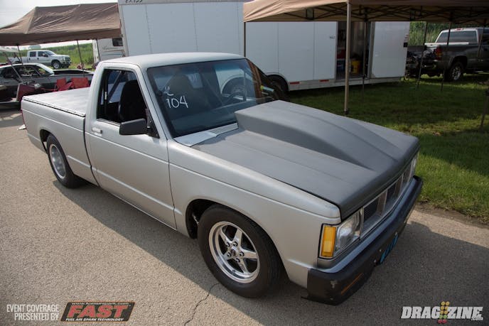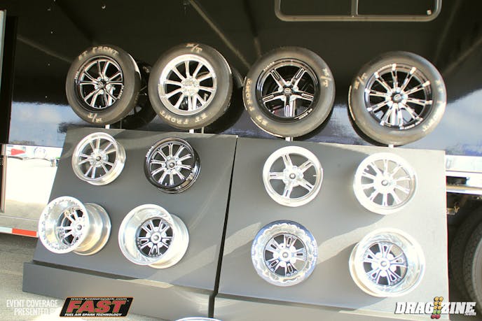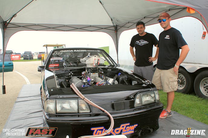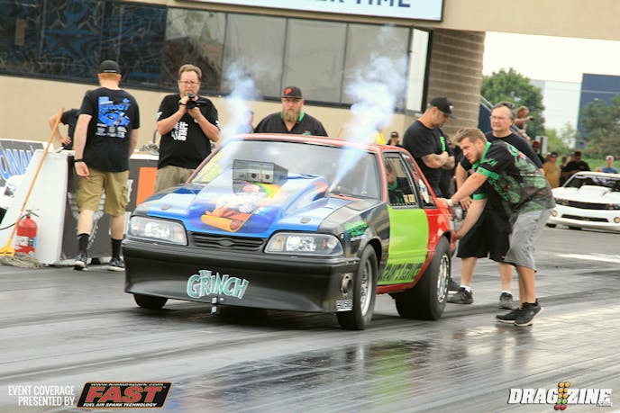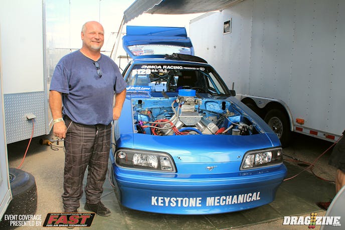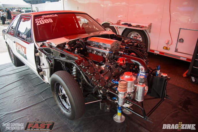 We dropped by Tim Matherly and Jacob Lamb's pit to catch up with the team mates. Lamb is second in Coyote Stock points this year after two wins and a semi final in Pennsylvania with his 1986 Mustang. Rules changes in the class have Lamb and several other racers switching from the Tremek T5 to the G-Force G101A Trans this event. Matherly has struggled a bit this year going at least one round at every event. Radial Wars racer Mike Hupp ran a 4.49 at 150 MPH on his first qualifier today despite the trans not shifting out of first gear. This was his first time on the Mickey Thompson 3062R radial slicks. The required tire in the new Limited Drag Radial class. Engines are done by Dustin Hiday at Simple Engine and Machining with chassis work by Andy Smith at Pro Tree Race Cars. Mike’s father in law Bob assists with tuning.