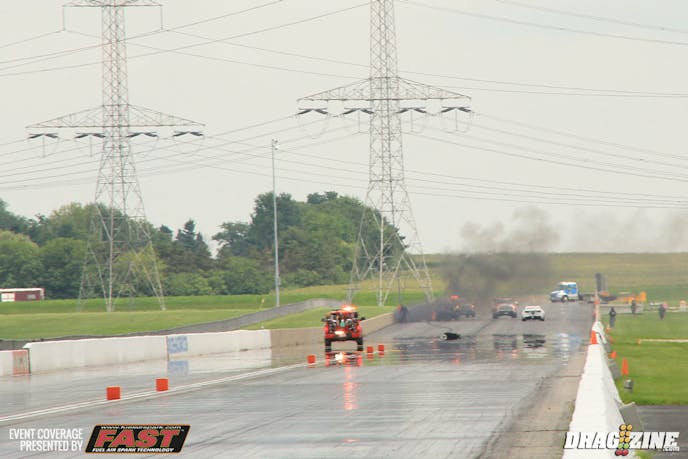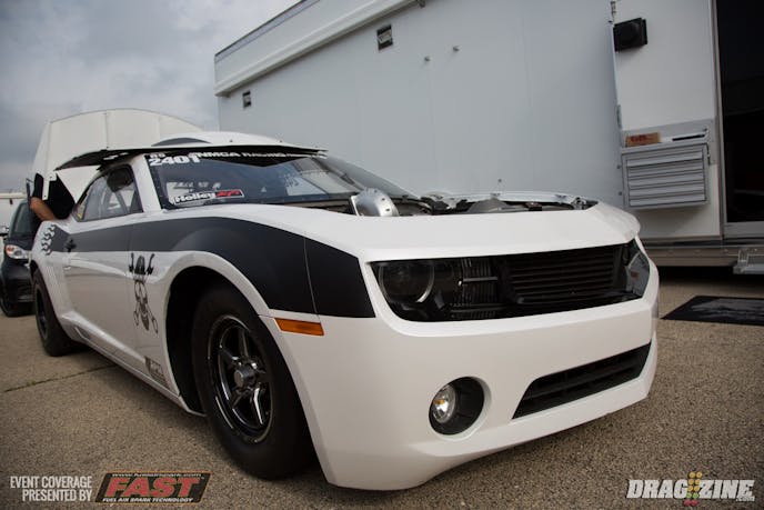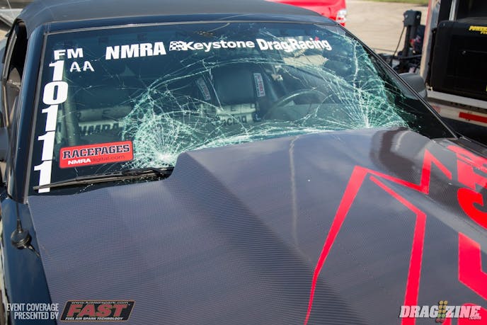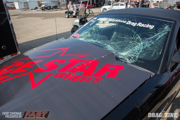 Not how you want a Saturday at the race track to start... Word from the pits is the driver is working on getting a new windshield for the first round of eliminations. Billy Banaka secured the number one spot in Pro Mod with a solid 3.89 pass in the first round of qualifying.Randy Adler was able to negotiate the tricky surface and put down a nice 3.94 pass during the first round of qualifying and is looking to step things up for the next round today.Richard Holt and his team put the big boy tune-up in their Camaro on a very exciting 3.98 pass where Holt had to wheel the car at the top end. Holt’s plan for the final session is to turn the car up even more and see what the track can handle