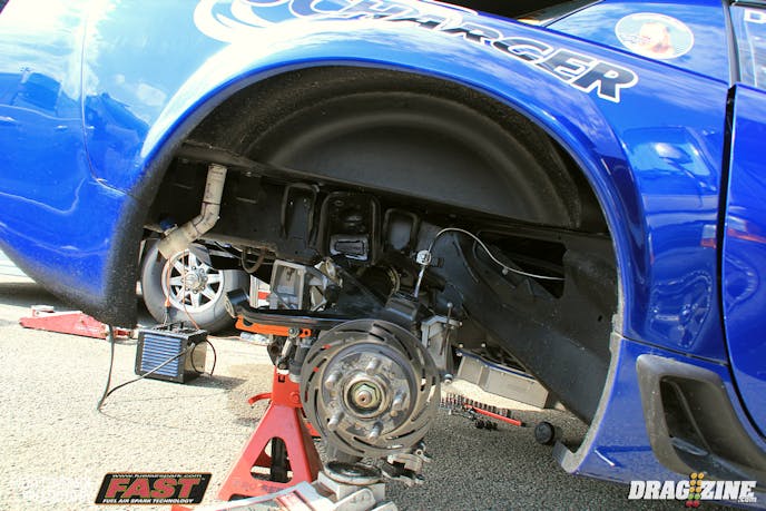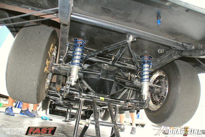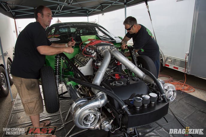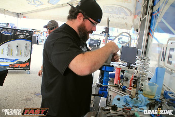 Joe DeDona struggled with traction today and spoke with Mark Menscer about it then pulling the shocks for a tune up and re-valving over at the Afco trailer before first round elims where he will face off with Jacky McCarty.