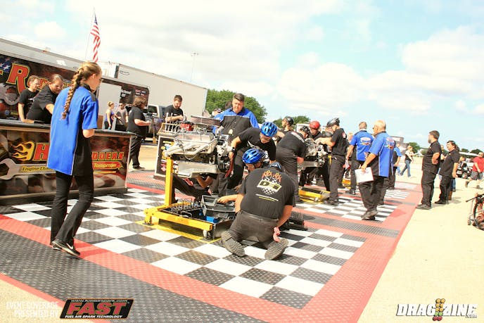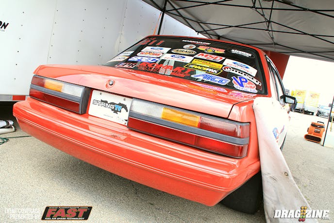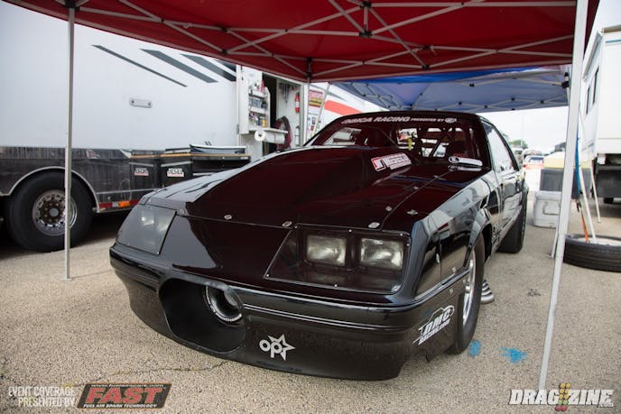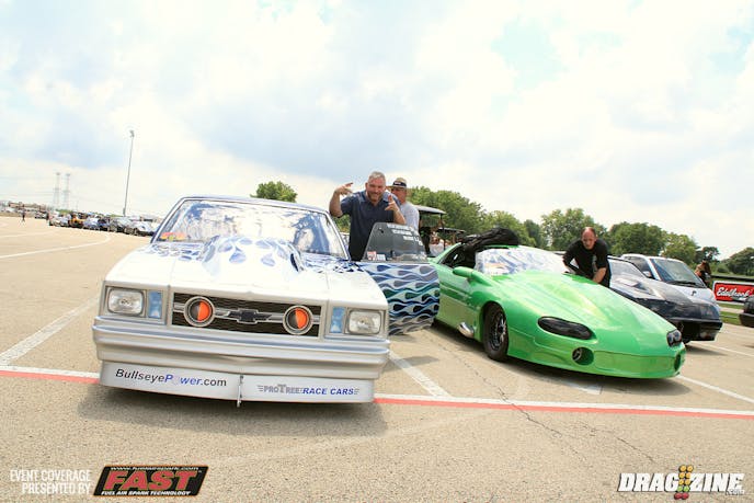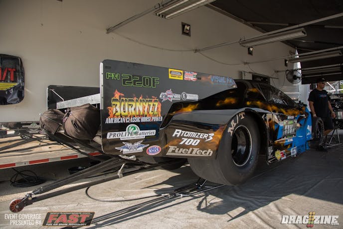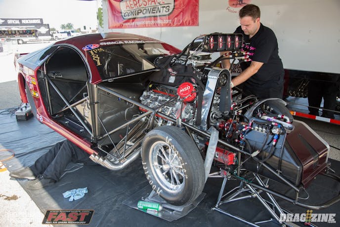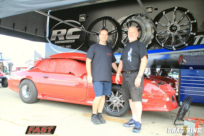 Dave Theisen runs NA 10.5 in his Firebird with Uratchco Racing Engines power topped with heads from Slick Rick and a Proformance Transmission. He is qualified third with an 8.08 at 171 MPH for his third event for 2016. Theisen moved over from the All Motor at Milan last year. Dave and Kevin were pulling the wheels off to swap to a new set of slicks.