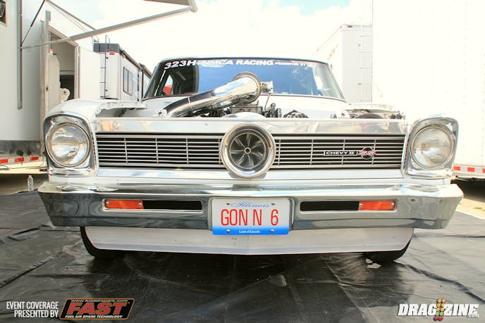 This gorgeous 1966 Chevy II is owned and driven by Hollis Jones. The F3R Procharged engine makes around 3200 horsepower on alcohol and is being tuned by Patrick Barnhill from PTP Performance this year. Jones ran the car here in Pro Modified two and three years ago but skipped last year and has come back for some Top Sportsman action this weekend. They will be looking for 6.70's this weekend with Steve Morris power in their second outing for the year. The chassis was built by JC from Performance Concepts. He set the carburated Procharged record two years ago with a 6.90 and has since switched to fuel injection for ease of tunability and horsepower capability with a best of 7.0 this year.