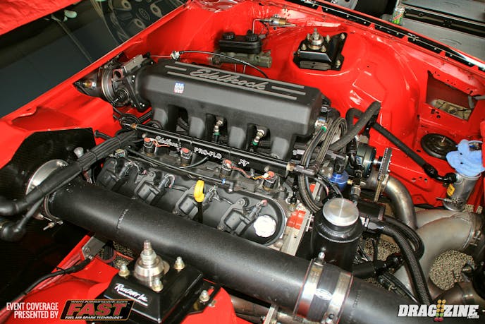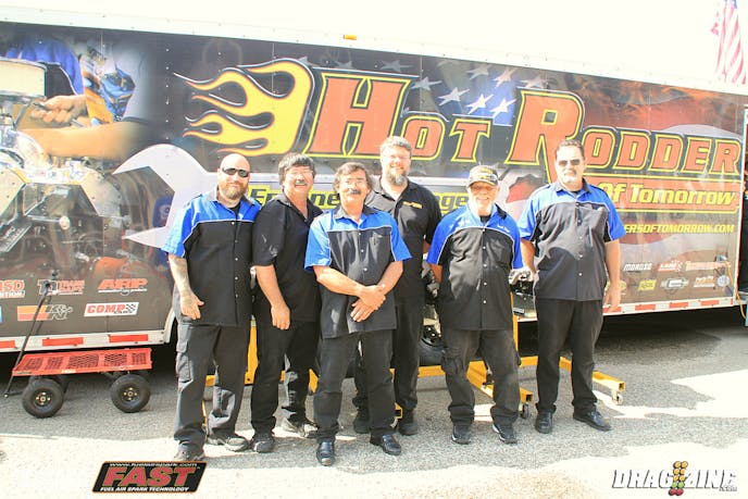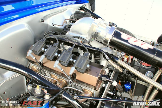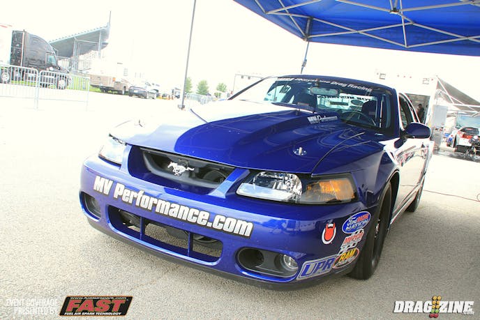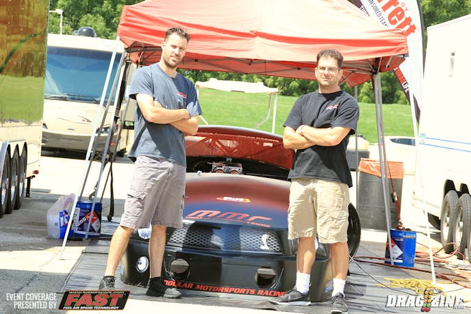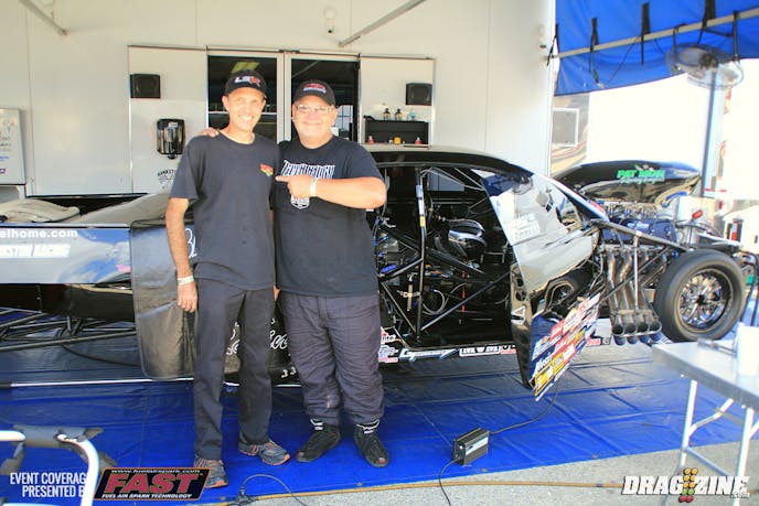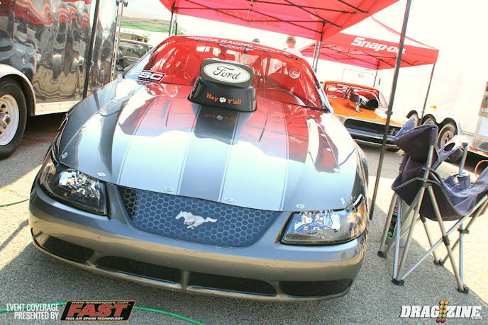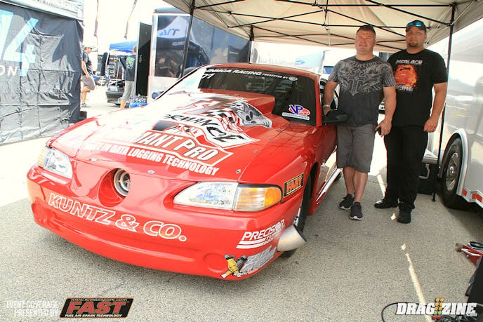 We stopped and Talked with Tim Savelle who ran a 3.83 at 201 in round two and is set to face off with Greg-Seth Hunter in the MMR sponsored Mustang. Tim has driven for Mike Bankston about eight years after running Top Sportman and Pro Mods of his own and as a hired driver. Savelle has lane choice over Hunter who has been running 4.0's and has been fighting a misfire this weekend and looking to get back on track and in the 3.90's next round. He is General Manager and an engine builder at MMR. The car uses a 351 inch Mod Motor fed by a pair of Garrett 88 MM turbos and will be the last event for this combo before switching to their own billet block and topped with Coyote heads. Tim Savelle is pictured with Keith Auwarter on the right and Greg-Seth Hunter with Mark Luton on the left.