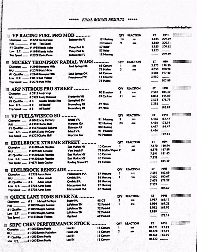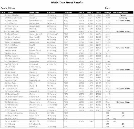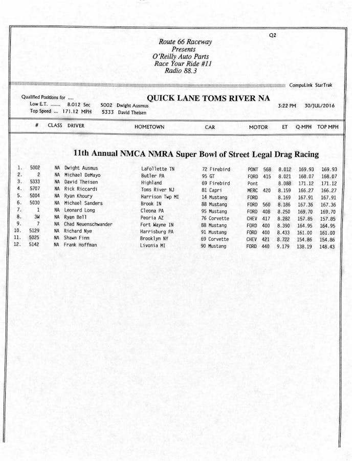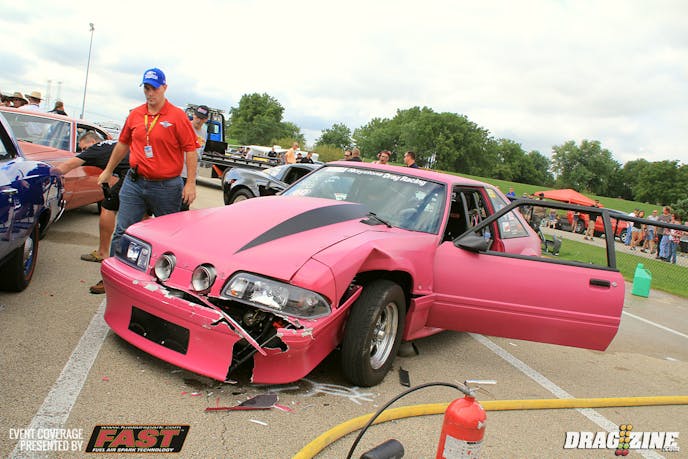 Cal Hayward, Chuck Watson and several other cars in the lanes for QA1True Street were involved in an incident with several cars receiving significant damage. Hayward's multi event winning “Pinky” Mustang has front and rear damage and sadly will not be able to compete in the class this weekend.