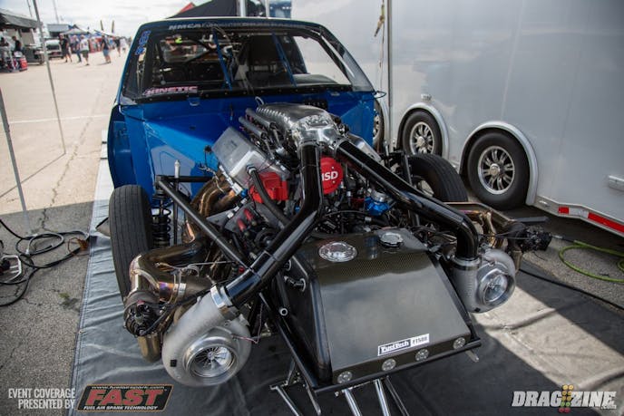 We stopped by number one Radial Wars qualifier Dewayne Mills pit and spoke with Pro Line Racing’s Jamie Miller about their day. Since we lost a qualifying session due to rain they put an easy tune in the car putting down a 3.98 at 197 MPH. He has been a best of 3.79 in St Louis and is the quickest turbo charged Drag Radial car and the first boosted car in the 3.70’s.We caught up with Pro Mod racer Tommy Dwyer who runs a blown 1970 Chevelle in the class. He lost a lifter in qualifying also damaging the camshaft which required a significant tear down to repair. The crew was still working on the engine when we stopped by but they were well on their way to reassembly and should be ready for eliminations later.Jimmy Dahl is here running Xtreme Street this weekend for his second time in the class after debuting at Indy with prompting by his long time friend and NMCA tech guy Dave W. He was running X275 and changed the turbo to a Precision 76 mm piece and class legal tires running an 8.0 today after running 7.80s at 177 in Indy. The engine is from TNT Racing Engines topped with TFS Hi Port heads backed by an ATF transmission and converter.