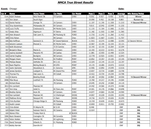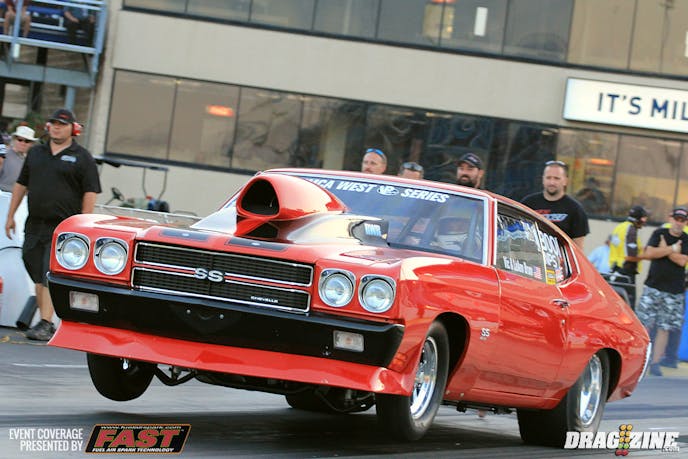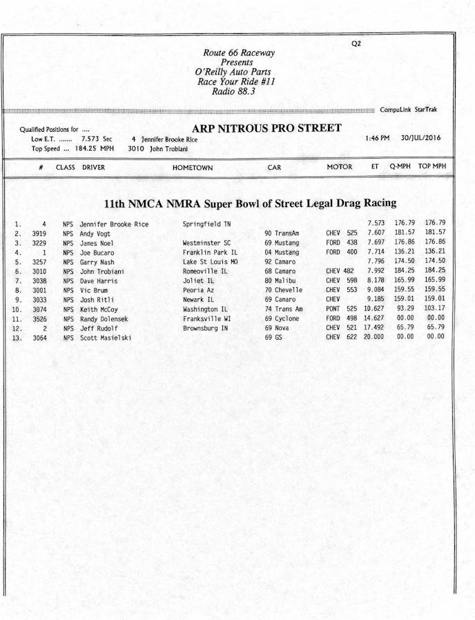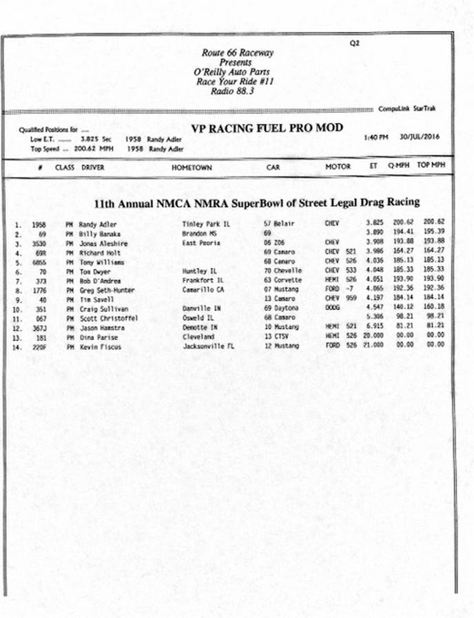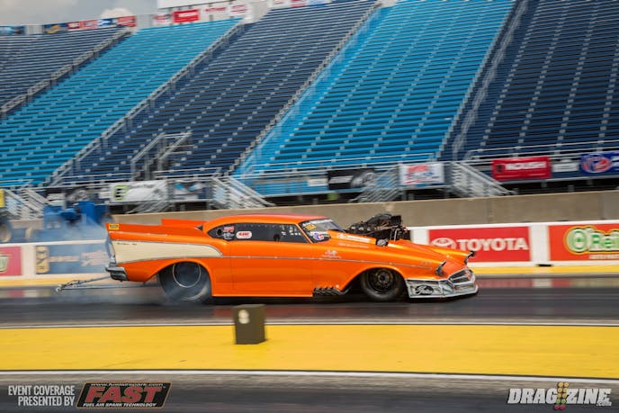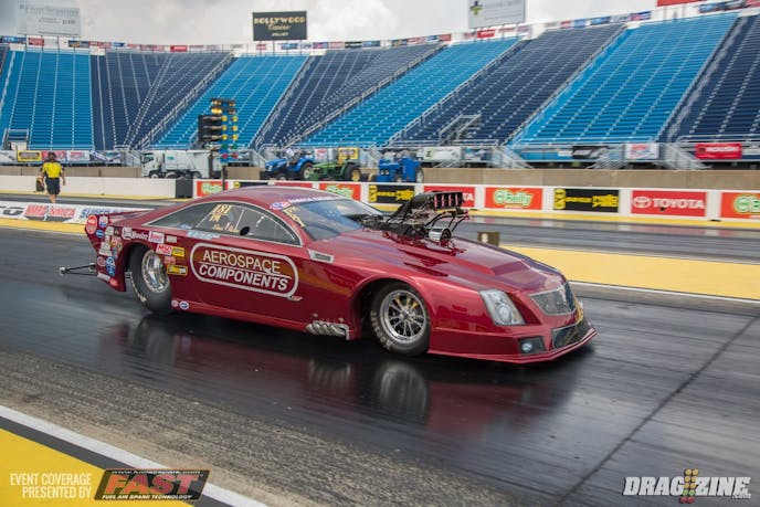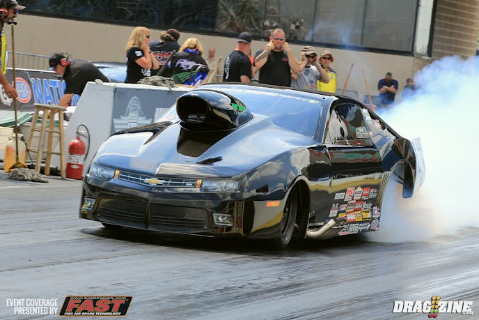 Current IHRA Pro Mod champion Dina Parise had a timing issue with her CTS-V during Q1, but the team has it fixed and is ready for Q2. Current NMCA Pro Mod points leader Scott Critstoffel shook the tires hard first round and is sitting 9th on the ladder. The team plans on some slight adjustments for the final round.Rob Valden shook the tires pretty hard in Q1 due to the tricky track and is qualified 10th currently.