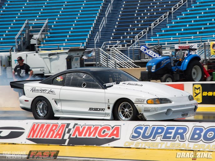 Shawn Pevlor reset the MX235 record last night with a blistering 4.67 pass. Pevlor's crew chief Jason attributes the improved performance to constant testing and the switch to a fogger system on the Mustang. The team is running nearly identical on the 235 tire as they did in their win at a Nitrous X event last weekend in North Carolina at Shadyside Dragway. Jennifer Brooke is using her fathers old turbo motor in Nitrous Pro Street at the Super Bowl as she chases her first championship. The team is very confident if the track can take the power they are trying to put down a Super Bowl win is within their grasp.NMRA racer Adam Arndt does some prep work to his Mustang for the next round of Renegade racing action. Arndt has been running like a bracket car all weekend peeling off passes in the 7.60s all weekend.