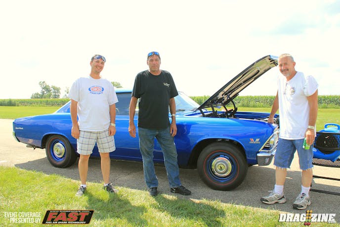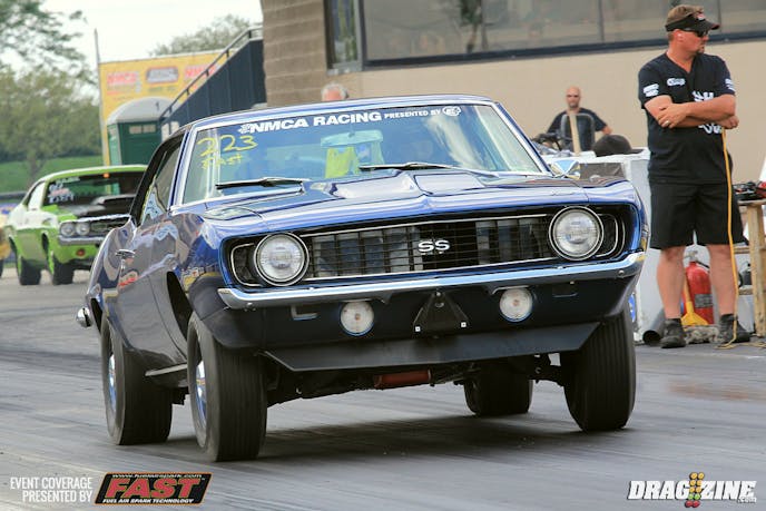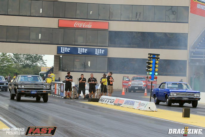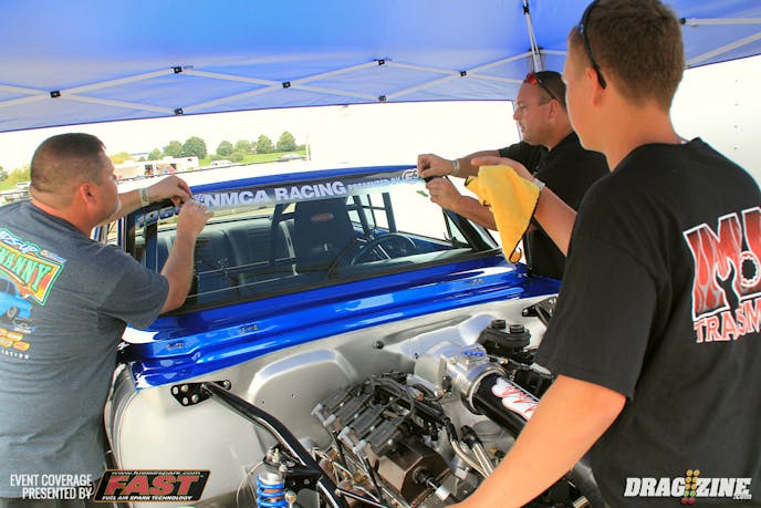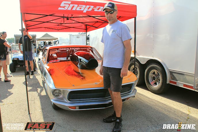 Rich Nye is running NA 10.5 this weekend and crew man Frank Edwards was helping to swap a lower gear to compensate for the not so great weather looking for some ET. This is his third even for the year taking a couple of events of to make some engines changes to a smaller cubic inch piece from Hamacker Racing Engines. He runs a G Force transmission from Leaonard Long with help setting up the clutch from James and Crystal Smith in his first years racing the class with NMCA. Andy Voght is a long time NPS racer based out of Desplains, Illinois working out some new things this weekend in his first event of the year. Long time friend Dave Klaput tunes the car with crew help from his brother Tony, his wife and daughter.Josh Ritli also runs in Nostalgia Pro Street with a new combination machined by Tommy Dixon this weekend. He made a couple of horsepower only passes to shake the car down and will be turning on the nitrous for round one eliminations. He took some time off after losing an engine back in 2014 and lives just a few miles away from here so came out for what is basically a test session. “ I gotta give Joe Bucaro a shout out for some help this weekend loaning me a battery and some other parts today.” – Josh RitliMike Gucciardo runs this cream yellow car in Pure Street for two years now in the class after switching from Mean Street. He has a fresh 311 in engine topped with Trick Flow heads from Kalui Motor Services out of South Bend, Indiana backed by a Tremec TKO 600 Trans from Walt at Pro Motion. Mike is a 19 year cancer survivor sporting a Livestrong badge on the front of the car. He gets help from Bruce Hmminger, Mike Washington and Ed Curtis from time to time. This is the second event for the new combo after it’s debut in Columbus, Ohio. They plan on doing a lot of testing before Bowling Green.