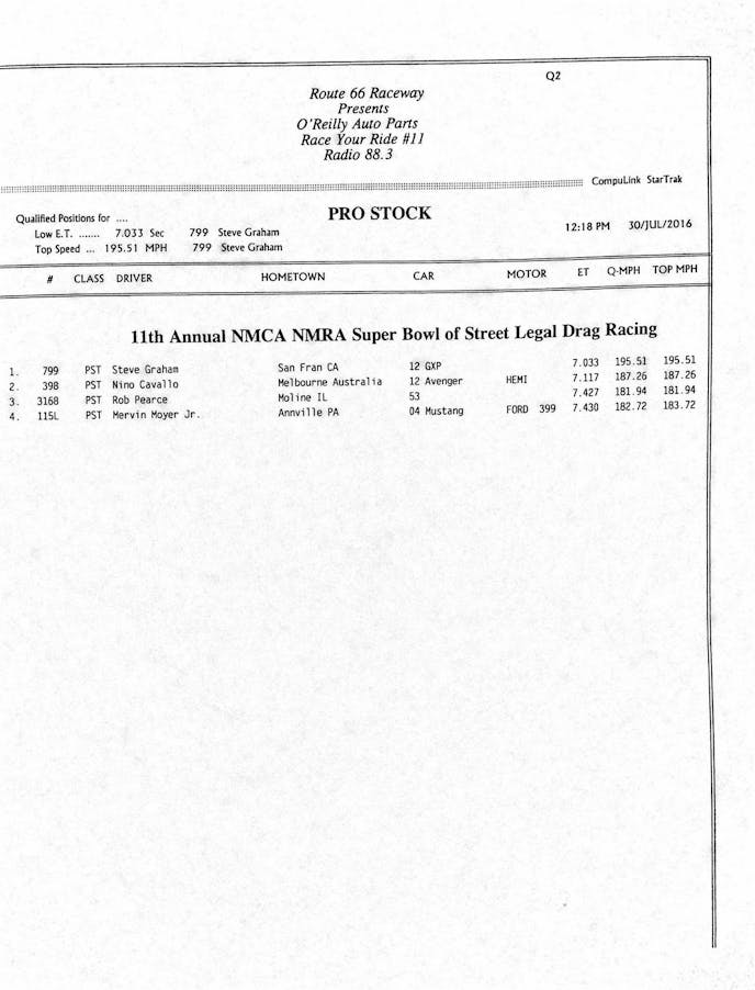 The first pair out in the new Pro Stock class was Nino Cavallo based out of Melbourne, Australia with his 2012 Avenger and Rob Pearce with his 53 Studebaker with Cavallo taking the win with a 7.11 at a 7.42 for Pearce. The other pair here this weekend is number one qualifier Steve Graham and Mervin Moyer Jr.. Graham would advance in his white GXP putting both Bob Book powered cars in the final tomorrow. Gardner Stone pulled a nice wheel stand in Holley EFI Factory Super Car on a single where Michael Skinner was not able to make the round running an 8.83 at 152 MPH on the run. Vic Brum hails from Arizona and made the trip “back East” with his 1970 Chevelle to run ARP Nitrous Pro Street qualifying eighth with a 9.08 at 159 MPH. He put up an 8.30 to advance to round two over Dave Harris and will meet with Jennifer Brooke Rice in round two who was top qualifier in class.Jarod Wenrick would advance to round two over Charlie Cooper with a 4.59 at 160 in Street Outlaw.Street Outlaw racer Joel Greathouse took out Randy Trulhar in a very nice 4.49 at 166 MPH.Shawn Pevlor had the earned single as top qualifier laying down low ET with a 4.67 at 155 MPH.