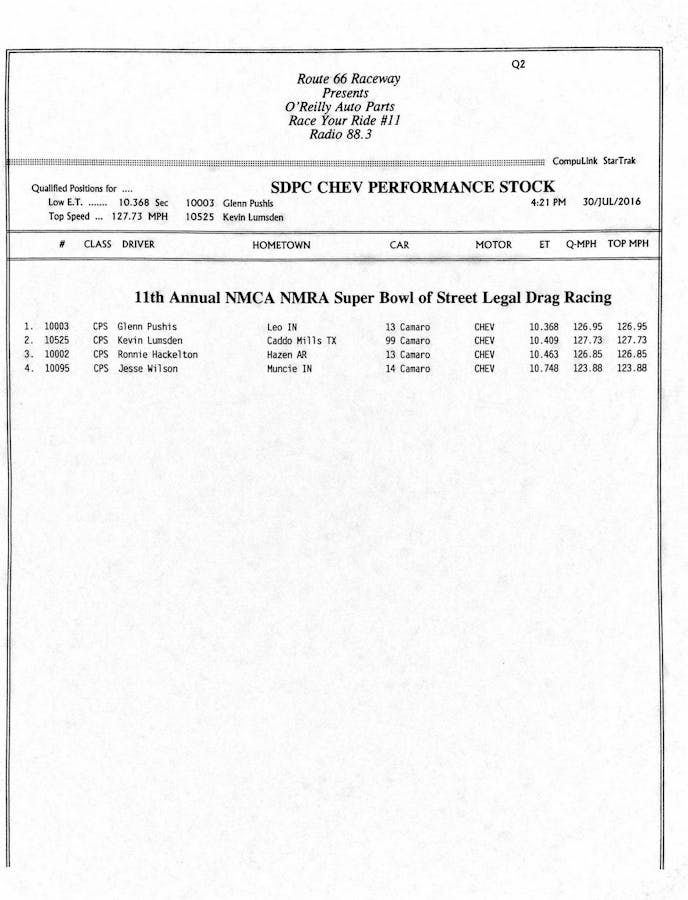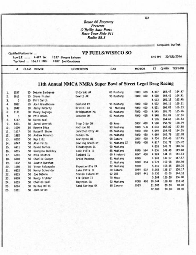 Things are set to kick off here at Route 66 Raceway for the 2016 edition of the NMCA/NMRA Super BowlStreet Outlaw and X275 kingpin Joel Greenhouse is on the property this weekend behind the wheel of the “White Riot” Mustang.Greg Powrie made the trip from Michigan with his Camaro for some Radial Wars action. Powrie has a brand new 481x bullet under the hood, along with a new pair of Precision turbos.Kevin Fiscus and Josh Klugger are making their return to the track this weekend with their Proline powered Mustang. The Pro Mod suffered extensive damage at Englishtown after a massive engine explosion.Charles Hull made significant changes to his Street Outlaw Mustang before the Super Bowl. The car now has a new Peterson dry sump system, and the entire turbo setup has been updated to match the new lower location of the turbo.Chris Bishir brought his twin-turbo LSX powered S-10 for some True Street action this weekend. Bishir has won multiple events with this truck, including a Hot Rod Dragweek title.Mike Bowen and his 1971 Ford Mavrick will be trying a few things this weekend in the always tough Coyote Stock class. He plans on a possible transmission change at some point in the future.Joe DeDona, a regular on the Chevy Performance Challenge Series is trying his hand at Street Outlaw this weekend with his ProCharged LSX Corvette.Nitrous Pro Street Champion Joe Bucaro is working on some converter repairs and changes ahead of his first qualifying session later this morning.Mike Kostick and his 1999 Firebird are making their first event this weekend with a new combo in NMCA trim. The Pontiac is powered by a 450 cubic inch nitrous huffing LSX engine. Everything is brand new from the motor, to the gear ratio. They are hoping to get some good data this weekend and see what the potential of the combo will be.Coyote Modified racer John Kauderer and his Cobra Jet are making a comeback after an expensive wheel stand at the Maple Grove event. The car is untested with brand new MMR motor, RPM Transmission, and 6.50 cert cage from Watson Racing in the car. The plan is to put the car on the track and let it eat to see what it can do.Reigning NMCA Open Comp queen Jenna Pierce Wilson is working on her program trying a brand new tire combo from Mickey Thompson here at the Super Bowl.Glen Pushis will be pulling double duty this weekend with his Factory Super Car COPO, and Chevy Performance Stock Camaro.Andrew DeMarco has a brand new combo for his Street Outlaw Mustang for the Super Bowl this weekend. Under the hood is an updated short block with new heads and class legal F1X ProCharger. DeMarco was tight lipped about the updates, but did say the car should run in the 4.50s this weekend with ease.Kenny Johnson is still working on shaking the bugs out of his 2010 Xtreme Street Camaro. The car is powered by a 385 cubic inch LSX that wears a set of DR heads and intake. The car gets boost from a 76mm Precision turbo. Johnson thinks that after he gets the car sorted out it should easily be a seven-second player in the class for sure.Jarod Wenrick won the first three NMCA Events this year in Wiseco Performance Products Street Outlaw and is leading the points for the class heading into the fifth race of 2016. A red light put him out early in the last event and the team will be focusing on a hot weather tune and going A to B here this weekend.We dropped by the Bankson Boys Racing pit earlier and chatted with crew member Keith Auwarter. Tim Savell has been to four NMCA events so far this year and is leading points and currently has the class record with a 3.767 with his 2014 Camaro. Team mate Billy Banaca has a new car from Jerry Bickel out for it’s third event for the year wrapped in a 69 Camaro body. Power for both cars comes from Pat Musi in the form of a 960 inch 5.3 bore space Chevy based engines.Randy Hackelton had made some changes in his COPO Camaro earlier this year but has switched things back for this event to the winning set up from Bradenton after three event losses since. He had not yet made a qualifying attempt when we chatted.Jason Hertel has sat out for a few years but is back out with a new combo in Coyote Stock and is another racer who has swapped to the G Force G 101A trans and an Ace clutch working with Cale Aronson and Bruce Hemminger on tuning. Jacob Lamb was instrumental with his advice on building the engine. Hertel debuted this combo in Ohio using it as a test session and formerly campaigned the car in Mod Muscle with sponsorship from Logan Motorsports.Scott Libersher Racing has three of his four cars here this weekend with two entered in Open Comp and the third, a 350 ci supercharged combo in the Factory Supercar Class against the Ford Cobra Jets. The other white car packs a 396 NA engine and the black car is driven by Scott’s son in law with a 350 ci. NA engine in Open Comp.