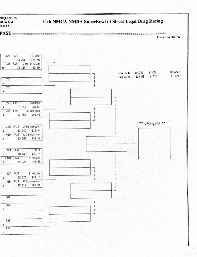 Defending Radial Wars champ Keith Berry went for a wild ride on his 4.31 pass in Q1. The C5 vette went into a MASSIVE wheel stand and came down very hard. The damage to the car was minimal and they will be ready to go for the final round of qualifying today. The NMCA has picked up MX235 for several races this year which is a class similar to Nitrous X and Ultra Street but running on a 235 series MT Radial tire running various power adder and NA combinations. Shawn Pevlor, Darren Hilterbrand, Chip Pike and Brad Medlock are some of the racers here this weekend. We stopped by Medlock’s pit for a chat this morning who is the current points leader and sits number one in qualifying after one session with a 4.83. Brad has some new parts on the car including a new Pro Torque converter and FAST engine management which has resulted in improved MPH testing in Holly Springs last weekend. Medlock uses Kuntz power and an M&M Transmission in the Mike Duffy built car formerly campaigned by John Urist.Dwayne Barbaree and Russel Stone are teamed up running Street Outlaw. We caught Dwayne taking some weight off the front end and making some suspension adjustments to better get a hold of the track today.Mike Jostick is running a new engine combo for VP Fuels/Wiseco Street Outlaw in 2016 with this being his first event for the year. He is running a 450 cubic inch LSX tall deck engine topped with Frankenstein heads and intake assembled by Mike Duke and topped off with NX Nitrous and backed by a transmission from Chuck Johnson at Finishline Transmissions. Brian Viara is the crew chief and partner with the combo with Kostick’s son Michael Jr. also assisting with various crew duties. Pictured is Mike and Carey Kostick who were just married on May 13 after 5 years together.Randy Truhlar runs out of the Midnight Racing team in Street Outlaw with a 598 BBC built by Shane Grit and backed by a Proformance Transmissions two speed TH 400. Steven Wardlow redid the car including paint roll cage and wiring over the past year or so with this being his first race out since the upgrades. “I’m grateful for all the help from Dave and the guys at Proformance and and Steve Wardlow for taking me under wing and all the help with the car.” – Randy Truhlar.NA 10.5 Racer Leonard Long has good mile per hour but had trouble on the starting line the past few events and has changed the shocks and springs out back in effort to fix the issues there. They were just putting on the hood scoop in preparation for round two qualifying.