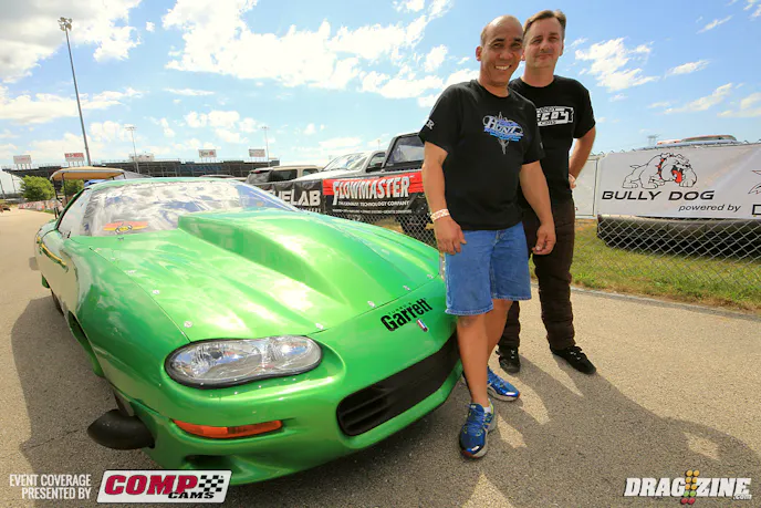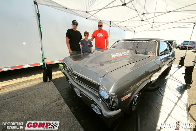 We stopped by the Hamstra pit this morning and spoke with Kevin Hamstra, VP Racing Fuels Pro Mod racer Jason Hamstra’s father. Jason has taken some time away from racing this year and has been focusing on tuning for some NHRA Pro Mod teams instead. Since the family lives just eighty miles from here and decided to put some laps on the car and have some fun this weekend at Route 66 Raceway. Jason has struggled with the set up and different track conditions than at NHRA national events and currently sits outside the 16 car qualified field.NMCA West 2014 Pro Mod Champion Rick Snavely made the trip from Los Angeles, California with the Turbos Direct Camaro. They went to Indy as spectators which was rained out and decided to fly back out and bring the car here for the NMCA/NMRA Superbowl to compete and are just one of several NMCA West teams here this weekend. The Bickel built car is powered by a MBR Hemi fed by a pair of Garrett turbos modded by Turbos Direct. Snavely is currently qualified sixth with a 5.98 at 238 MPH. Rick Snavely pictured on the right.Pete Llamas has his TA Race Cars built1972 Nova here this weekend for some Stainless Works Street Outlaw action. He normally races locally in X275 at Great Lakes Dragway running in the 4.80 range. He runs a 565 from Goodwin Competition topped with a Nitrous Outlet Stinger plate system backed by a PTC converter and Proformance Racing Transmission with sponsor help from Bullseye Boring. From left to right, Pete Llamas, his son Gage and Pete Llamas Sr.We stopped by David Hutnick’s pit and spoke with Kevin Stevens from Straightline Performance. Hutnick took number one qualifier after two sessions in Edelbrock Xtreme Street with a 7.66 at 180 MPH, a new personal best for the team on a slick. The BTR built engine features Edelbrock heads, intake and nitrous system topped with a CFM built Dominator carb. David chimed in to thank Lane from PTC, Dave Klaput from Proformace Transmissions, Winner Circle Speed and Custom and Carey Redmon and Craig Parker from Edelbrock.