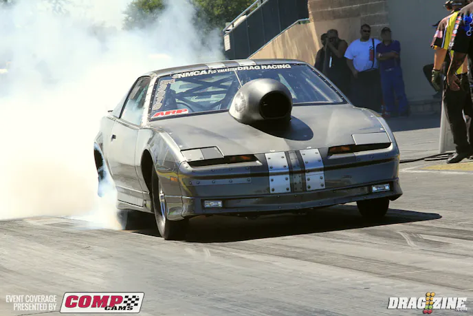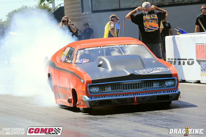 Clint Satterfield and Willard Kinzer were paired for round one eliminations with Satterfield taking the starting line advantage and promptly moving hard to the right at the hit. He pedaled the car but moved right again before lifting as Kinzer went on to a6.18 at 245.63, his best run of the weekend.Brian Hicks and Josh Green had an interesting match with a staging duel that went on well over a minute before Josh’s father Dan approached the car and waved him to stage. Both drivers were late on the tree with the advantage going to Hicks. Both cars were on good runs but Hicks lost an engine before the stripe slowing to a 6.07 at 213. Green was game with a 6.36 at 218 though the round went to Hicks setting the team up for a long night repair the engine.Jennifer Brooke Hicks met with Gary Nash in ARP Nostalgia Pro Street taking the advantage at the tree and going on to take the round with a 7.46 at 178, well over a tenth better than her qualifying lap.2014 NPS Champion Don Baskin and Andy Vogt met with Vogt taking a bite out of the tree with a .022 reaction to Baskin’s .072. Vogt had qualified second with a 7.36 to Baskin’s off pace thirteenth and he slowed only slightly to a 7.40 while Baskin improved greatly to a 7.32 at 186 earning the upset win a and will fave off with Rice in round two.Marty Robertson and Peter Campbell faced off in Radial Wars with Robertson gettign the win, albeit an expensive one as he backfired after the stripe blowing the intake apart and sending shrapnel and bolts flying across the track and high into the air.Brian Mitchel and Curtis Catalon were set to have a good match as number seven and eight qualifiers respectively. Mitchel took the tree first nailing a .001 reaction to Catalon’s .069. The two were side by side but for the starting advantage for Mitchel. At the stripe Mitchell put up a 7,910 at 175 to Catalon’s game 7.915 at 169 giving Mitchell the nod to move to round two.NMCA West racer Tony Aneian met with Chad Nevenschwande out of Ft Wayne, Indiana in Quick Lane Tom’s River NA 10.5 for an interesting match. Nevenschwande turned on the red light with a -.038 reaction seemingly ending his day right there however Aneian left hard and got out of shape early in the run crossing the center line and nearly taking out his opponent and doing a great driving job to avoid a two car crash and avoiding the wall giving Nevenschwande another life in the class.