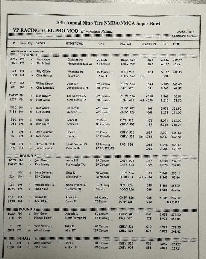 Josh Green and Steve Summers made up the final round of VP Racing Fuels Pro Mod. After a bit controversy on the first try the pair was given another go for the final match with Summers gettign away first with a nice ,025 reaction time. Green’s .051 was not bad by any means in the class and the two were on a run with both drives gettign away clean. Summers hit the stripe just off his best lap running a 5.86 at 254 to Green’s stout 6.02 at 237 MPH, his best run in competition.In the final of ARP Nitrous Pro Street it would be number one qualifier Joe Bucaro vs 2014 champ and thirteenth qualifier Don Baskin. The race was over at the start with Bucaro going red handing Baskin the event win.