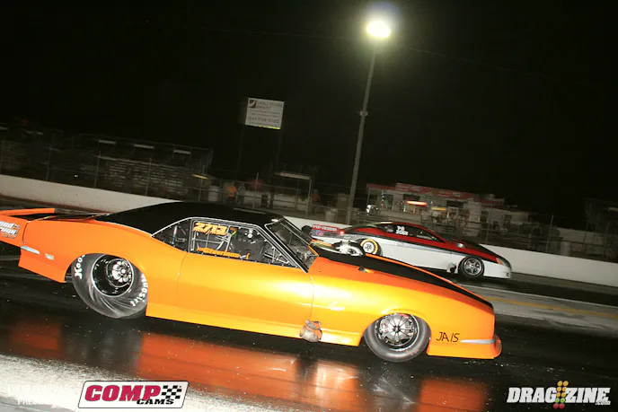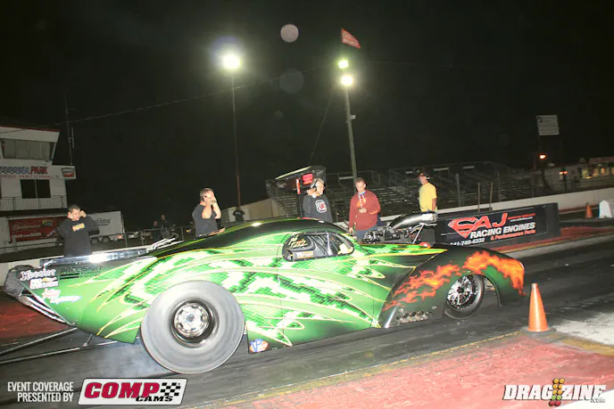 Frank Cersosimo (left) and Raymond Commisso, who has a brand new car this weekend, left hard but struggled past 100 feet in todays test session before the rain dampened the afternoon. Hopefully the weather will pass and the staff can get things dried off for tonight's scheduled bracket race and heads up testing.