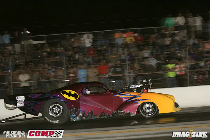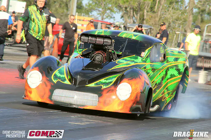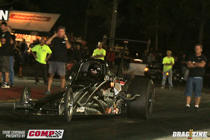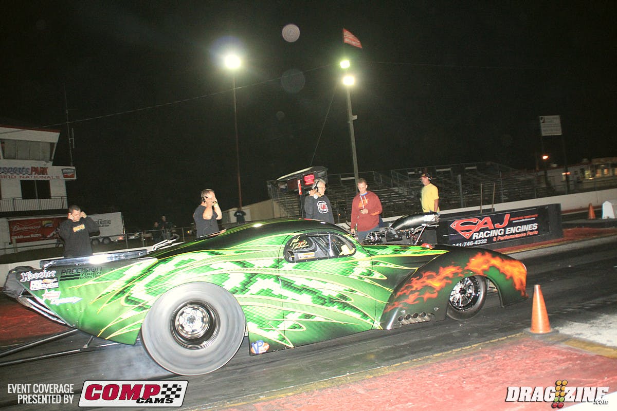 Pevlor and Pirez' nemesis Walter Drakeford sit two and three respectively. Troy Pirez Sr. led off Outlaw 632 today running a 4.55 at 163 MPH earning top MPH for the round and number three qualifier when the round was finished.. OL 632 has also picked up some new sponsors adding to the Induction Solutions title sponsor with PTC, Voss Racing Engines, Atlantic Collision and Carson Innovation Inc.Jason Juday earned top qualifier in OL 632 running a 4.48 at 160 in his Scotty’s Racing Technology, Induction Solutions 68 Firebird.Charlie Johnson also runs a 68 Pontiac but sports small tires on the car occasionally doing double duty in X275 at select events.Randy Hix has stepped up his game with a fresh 598 cubic inch big Chevy engine out of Fast Forward Race Enginesto motivate his 38 Chevy Coupe just installed this week. They are starting off easy getting the car and tune sorted out. He put up a 4.99 at 139 this session.Jay Cox ripped off a very nice 3.81 at 197 to earn top qualifier in Aerospace Components/Buck Racing Engines Outlaw Pro Mod.Rick Fleck put his 41 Willy’s in second spot running a 3.84 at 191 for the Lexington South Carolina based racer.Kevin Fiscus sits third but took top MPH for the session with a 207.27 MPH blast.Ken Cruz is sporting new paint this weekend applying the base and clear coat at his shop in Largo, Florida. He had Mark Anderson from Liquid Lenny’s Custom’s apply the custom flames. The car is looking good but will sit out the rest of the event of a broken fuel line leaned out the engine resulting in losing two connecting rods. Cruz told us there was a lot of fuel spraying and he was just glad it didn’t catch fire in the traps.Dan Stevenson ran into some serious tire shake in his qualifying attempt shutting it down early on the run.Jerico Balduf is all fixed up after running off the end of Orlando at the OWSN a few weeks back. Their painter picked up the nose in Orlando at the track and had it ready asap so they didn’t miss this event. He is currently not qualified.Phil Esz put his Procharged 2006 Spitzer dragster on top of Performance 2Way Communications Open Outlaw with a 3.73 at 188.Cynthiana, Kentucky based Ashley Tidrick sits second in class with a 3.76 at 192. She also runs a Spitxer chassis though it’s a newer 2013 model car running a Procharged 521 cubic inch Hemi.Brian Bednar wowed the crowd and likely himself on this wheel stand which isn’t very common with dragsters.