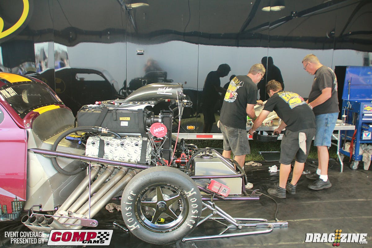 Chad Opaleski ran a person best 4.13 last night but paid a small price losing the head gasket on number one cylinder knocking him out of competition today. The team has faced a few issues related to the older parts used and is gearing up for a new engine from Fast Forward for 2016 which will add some reliability to the program. The 4.13 makes him the third quickest Procharged radial car. Rob Zark and Chad Opaleski (right) pictured. Jerico Balduf and crew are wrapping up routine maintenance this morning preparing for round one of Performance 2Way Communications Outlaw Pro Mod. The family based team has ran the car about three years now and have been creeping up on the tune, they are the fastest blown car in qualifying this weekend sitting third with the Jan Cen powered Gotham themed Willy’s.
