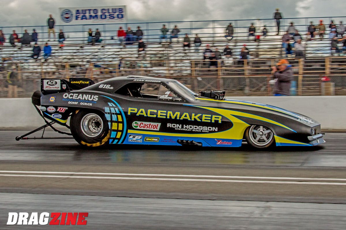 McIntire’s amazing run was a highlight for the AA/FC class, but the category is going through some changes that are not so popular with all the fans and many of the drivers. A new body style started to emerge last season and this has carried over to this season. In 2016, Ryan Hodgson brought out his “new” Spitzer 1969 Camaro-bodied Funny car. By the time the California Hot Rod Reunion came around, Dan Horan Jr. also had one. Unfortunately, the car looks more like a modern day Pro Mod than a Nostalgia Funny Car.