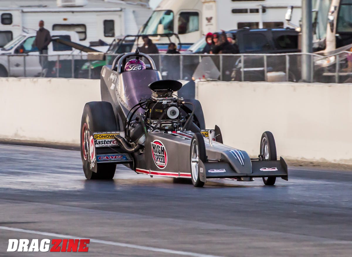 5.724, followed by Dusty Green (in the Nitro Hemi dragster) at 5.735 and Adam Sorokin (in the Champion Speed Shops Chevy powered dragster) at 5.738 seconds. The 8-car field bump spot is held by Mendy Fry in the High Speed Motor Sports dragster at 6.027 seconds. Fry may need to “pull the proverbial rabbit out of a hat” in her opening round match up with Bartone. But, don’t expect the High Speed Motorsports team to go down without a fight.
