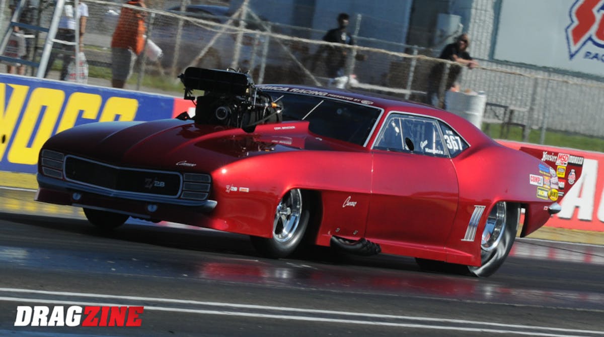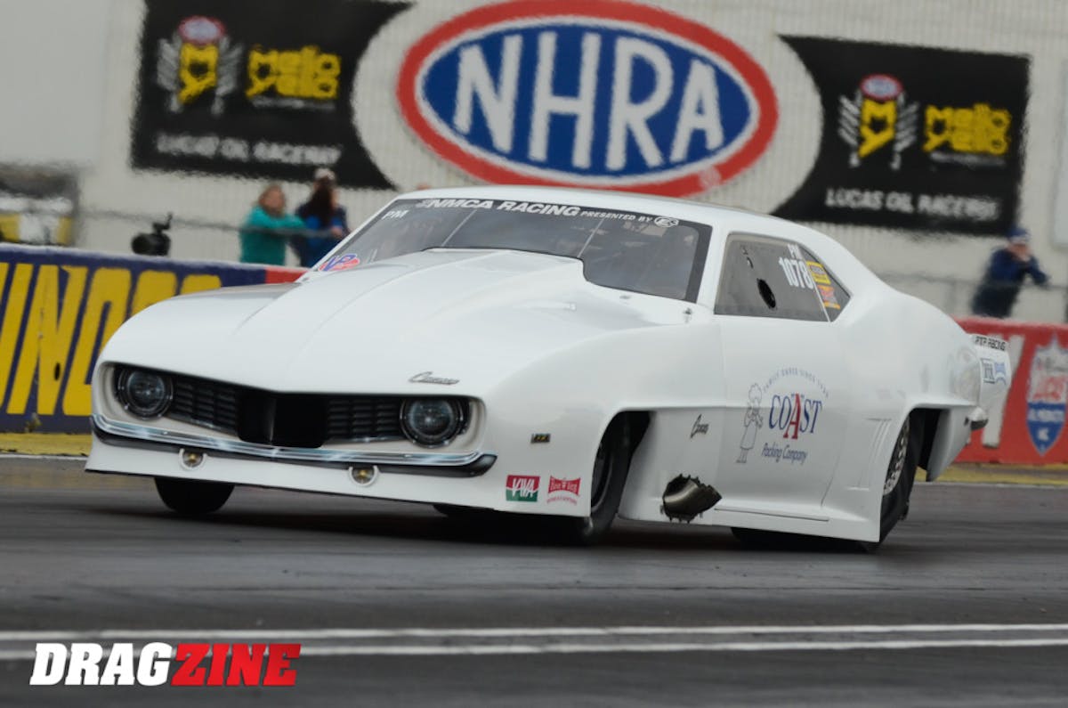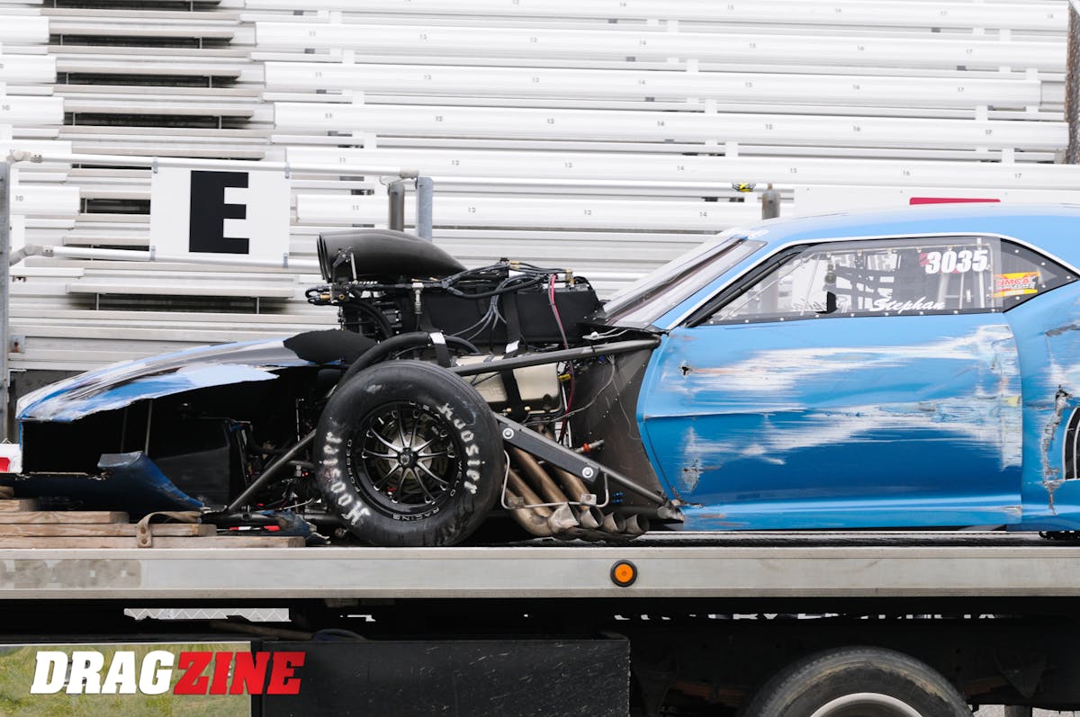 Xtreme Pro Mod racer Stephen Brinegar went for a wild ride in the second session of qualifying this morning when he lost control of his supercharged 1969 Camaro and struck the retaining wall near the 1/8-mile finish stripe. With the conditions ripe for improvement on the qualified ladder, Brinegar admits he hopped-up the combination to punch unto the 3.70s. The Camato carried the front wheels and began to draft out of the groove -- Brinegar crossed the centerline stripe and overcorrected to avoid John Stanley in the opposite lane, making a beeline into the wall. "It kind of washed out to the right a little bit, and then it started paddling the tire and then it went on harder to the right and came around on me. We'll front clip the chassis and replace the quarter panel and the front end and we'll be back. That's drag racing."