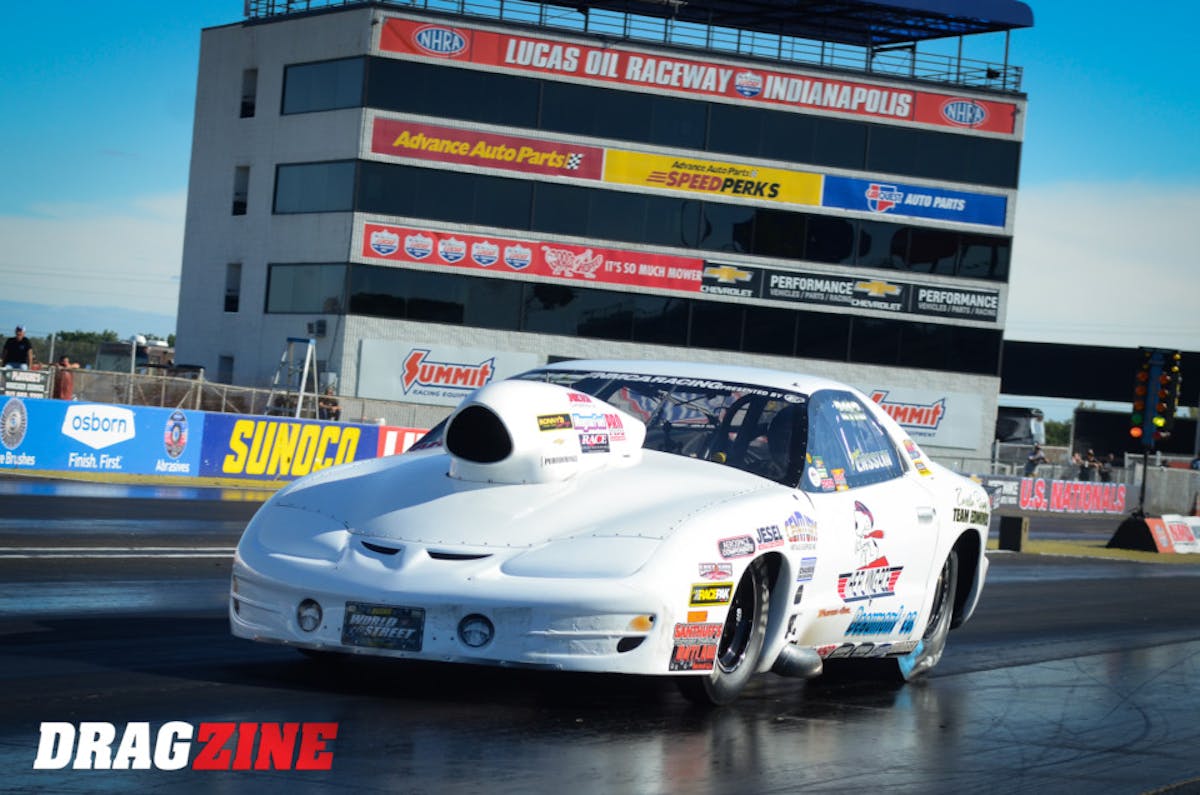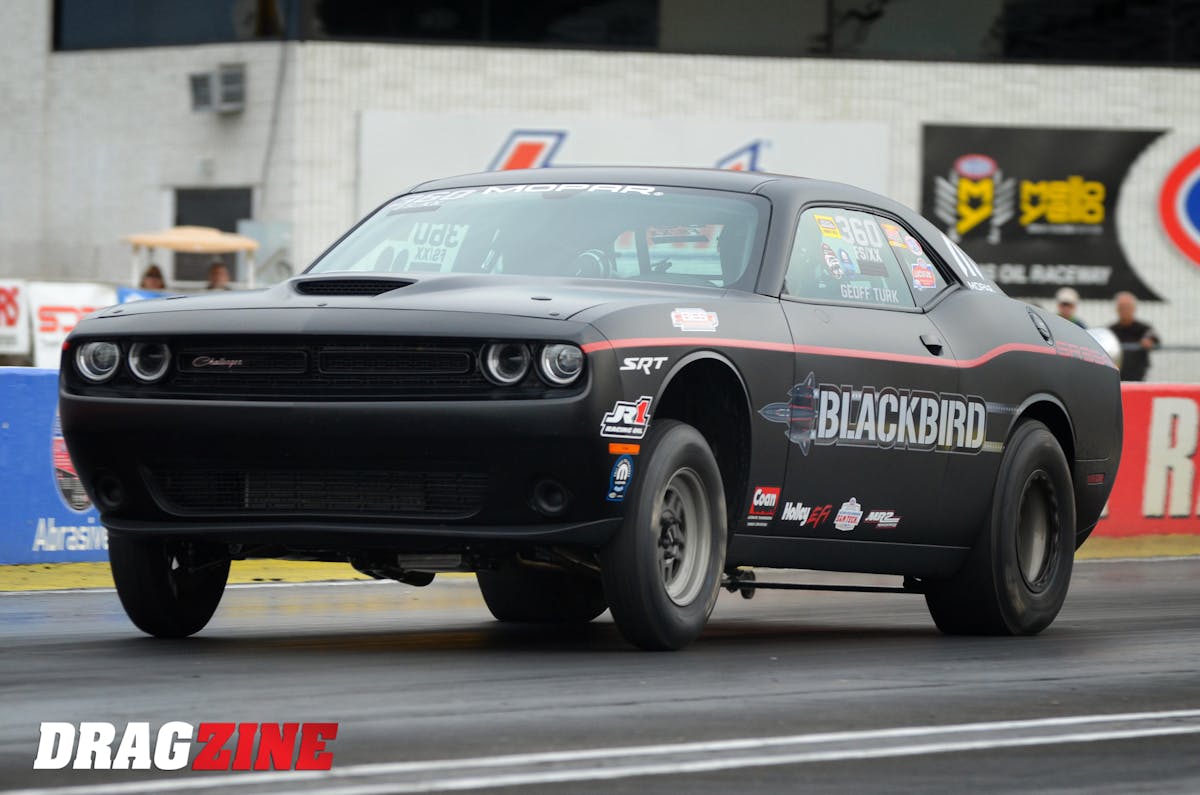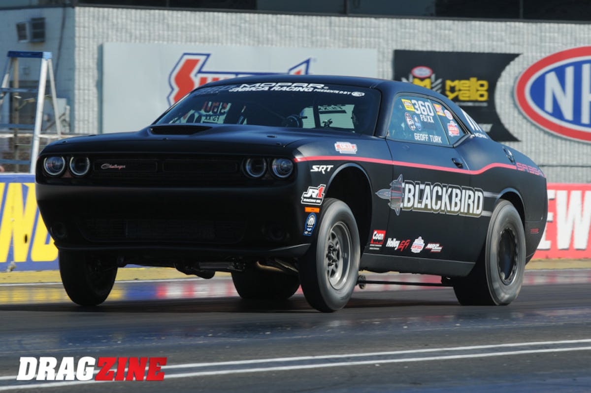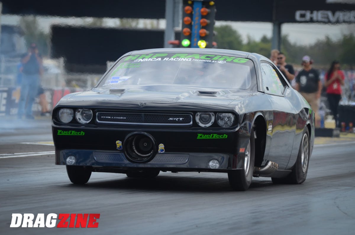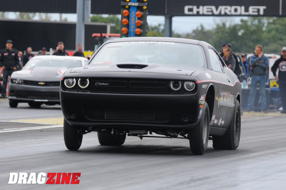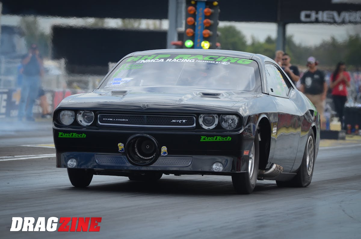 Geoff Turk stood the Factory Super Cars class on its ear in the second round of qualifying, blasting to a 7.98 to put a full tenth of the rest of the field. Turk is still the only competitor in the class to record a 7-second run in competition, doing so at Bradenton, Atlanta, and here at Indianapolis. This event marks the first since the NHRA adjusted its minimum weights (and thereby altering NMCA regulations, as well) that were designed to slow the Dodge Challenger Drag Paks. As Turk noted in a story here on Dragzine earlier this week, the 25-pound addition made little difference on the racetrack.