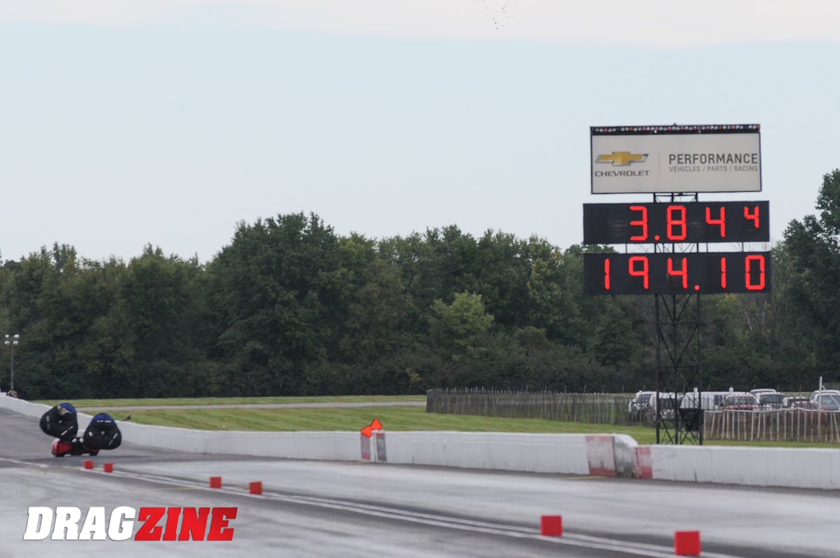 With the Radial Wars championship in hand, James Lawrence set his sights on the national record of 3.858-seconds, set by Marty Stinnett in Bradenton. He put a leg up on the mark in today’s second session, going 3.844. If the Dragzine team can win the event and close the season with the elapsed time record, it would mark one of the more impressive endings to a season in recent memory.
