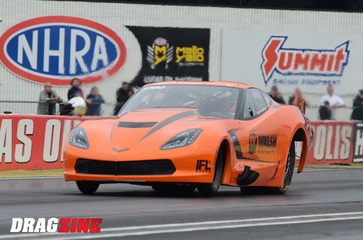 James Lawrence, driving the Dragzine C7 Corvette, sealed the Radial Wars championship simply by making a qualifying run this weekend. With the title settled, Lawrence and company set their sights on the national record — in the second session today under overcast skies and brisk temperatures, they put a leg up on the mark, going 3.844. That run not only was the quickest in the history of the Radial Wars class, but is also a centrifugally-supercharged radial tire record. The team hopped the ProCharger-fed machine up for the final session in hopes of going a low .80, but kicked the tires loose early and slowed. The 3.84 marked the only three-second time on the qualifying sheet, with David Adkins rounding things out second with his 4.03 and Marty Stinnett third at an off-pace 4.43.