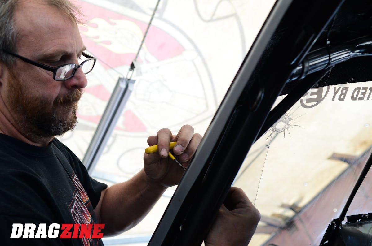 The team, without a complete, spare windshield, has patched the corner of the window with a spare piece of lexan and replaced the gear section in the transmission to make their second round matchup with Craig Sullivan.