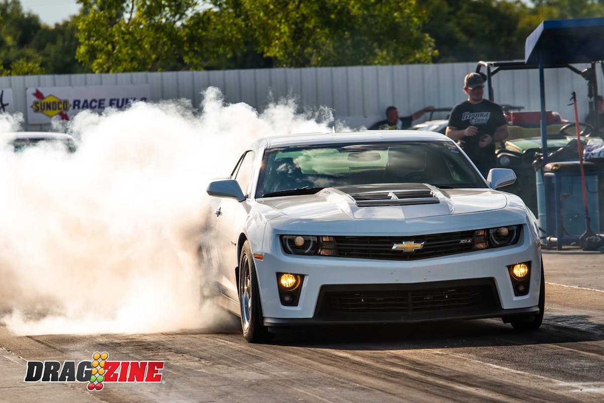 James Lawrence, driving the Dragzine C7 Corvette, sealed the Radial Wars championship simply by making a qualifying run this weekend. With the title settled, Lawrence and company set their sights on the national record — in the second session today under overcast skies and brisk temperatures, they put a leg up on the mark, going 3.844. That run not only was the quickest in the history of the Radial Wars class, but is also a centrifugally-supercharged radial tire record. The team hopped the ProCharger-fed machine up for the final session in hopes of going a low .80, but kicked the tires loose early and slowed. The 3.84 marked the only three-second time on the qualifying sheet, with David Adkins rounding things out second with his 4.03 and Marty Stinnett third at an off-pace 4.43.