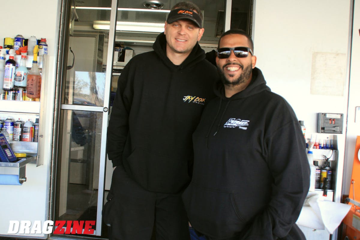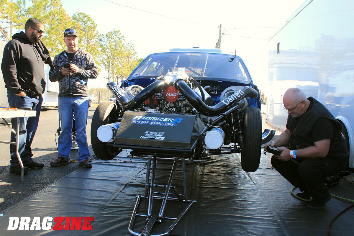 We stopped by Jay Cox’s pit this morning and found him chatting with Victor Alvarez, who bought in as a partner to Bradenton Motorsports park last year. Cox unloaded Wednesday with a 3.72, a good solid hit to start the new year off. Victor told him he better get ready for a .68 and that is the number that popped up Thursday morning for Jay who plans to run the full PDRA season and Mad Mule Shootouts and a couple of the Carolina Extreme Pro Mod events. Jay Cox with Victor Alvarez as right.Wild Bill Devine is entered into Pro Modified this weekend and awaiting on new Big Bubba tires to be mounted. Bill has been doing some NT racing recently with Pinks and made improvements to the ET. If all goes as planned Devine may see a 3.80 this weekend after some suspension changes and a new anti roll bar was installed.