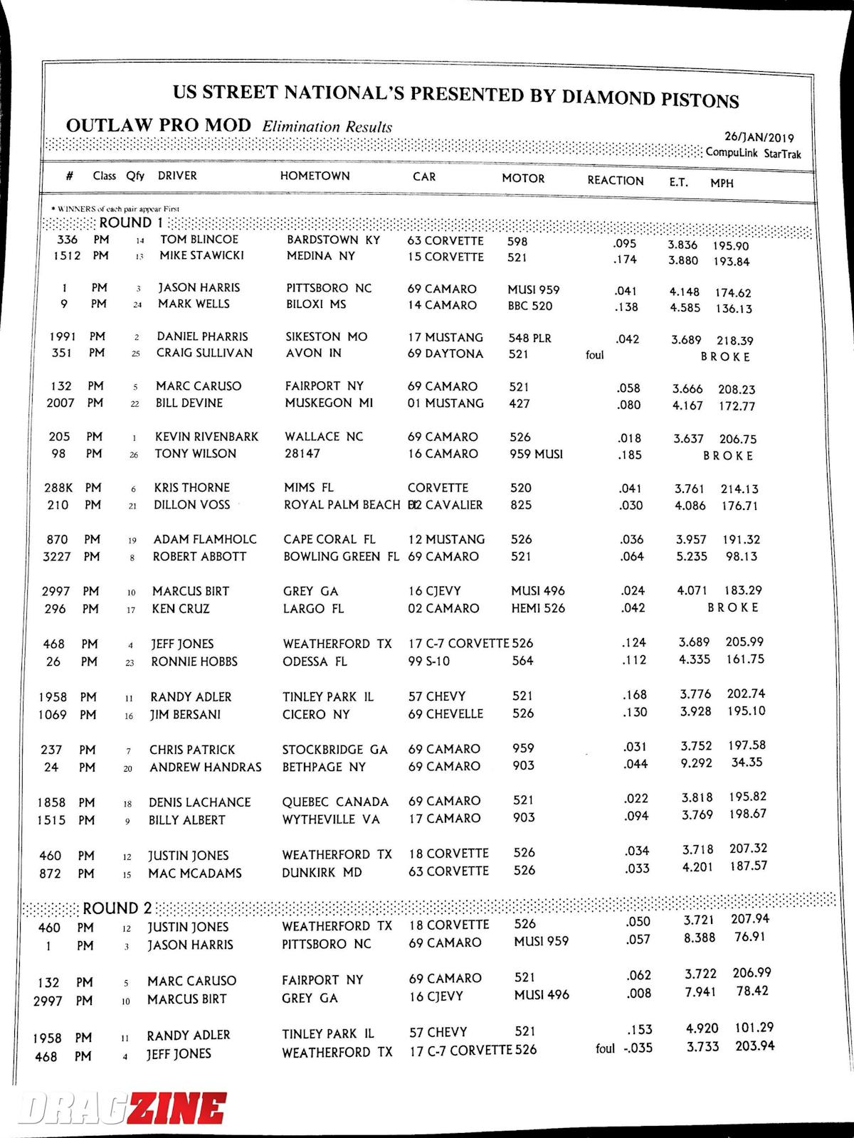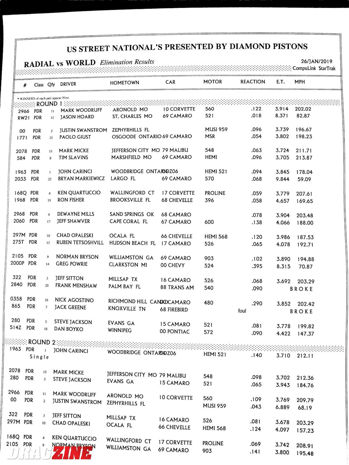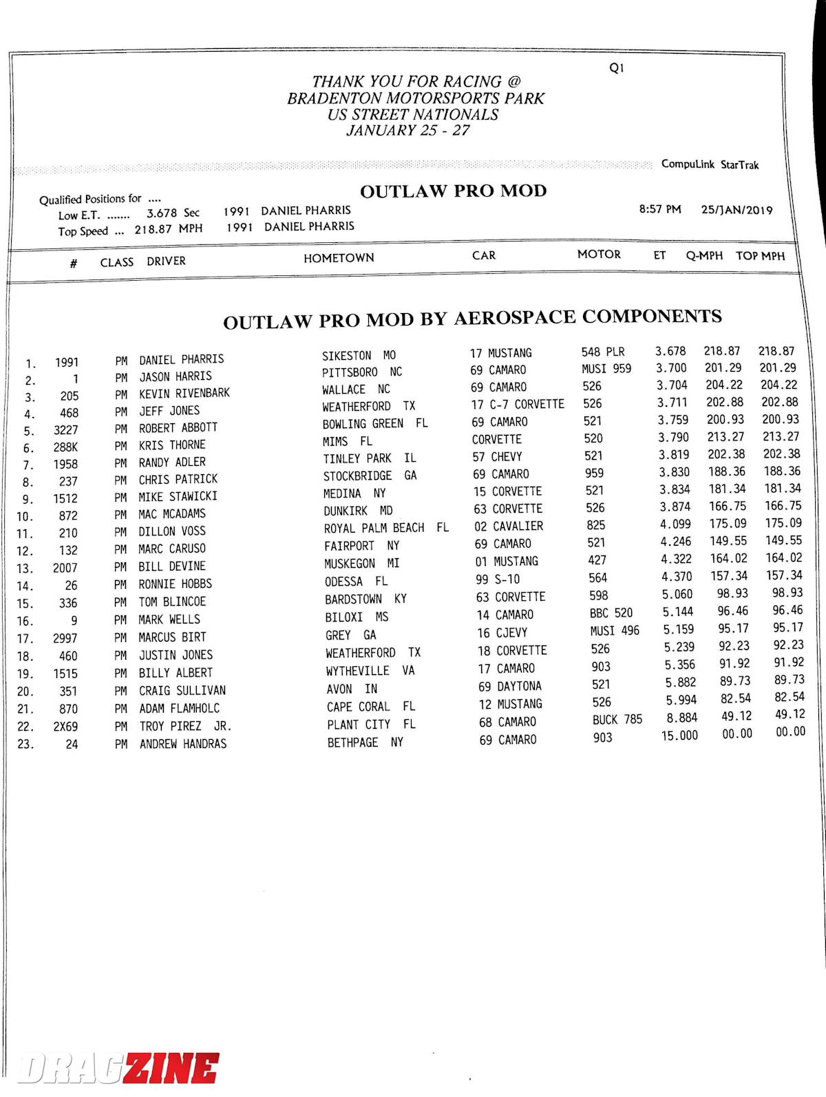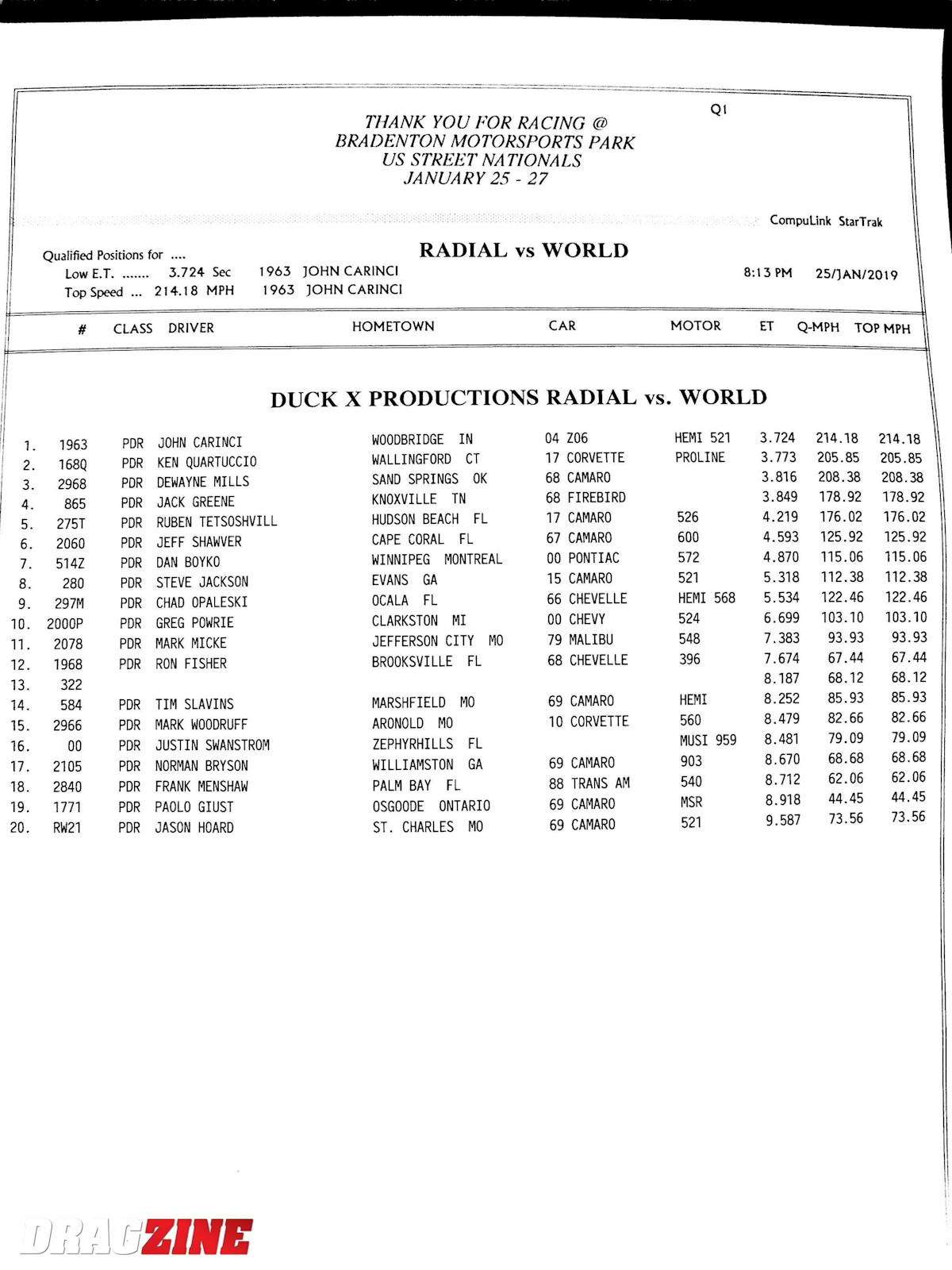 Duck X Radial vs the World. Aerospace Components Outlaw Pro Mod, Open Outlaw. Daniel Pharris led the Outlaw Pro Mod field with one session of qualifying in the books setting another personal best with a 3.678 at 218 MPH.John Carinci napped the top position in Radial vs the World with a 3.74 at 214, a solid run for Carinci.