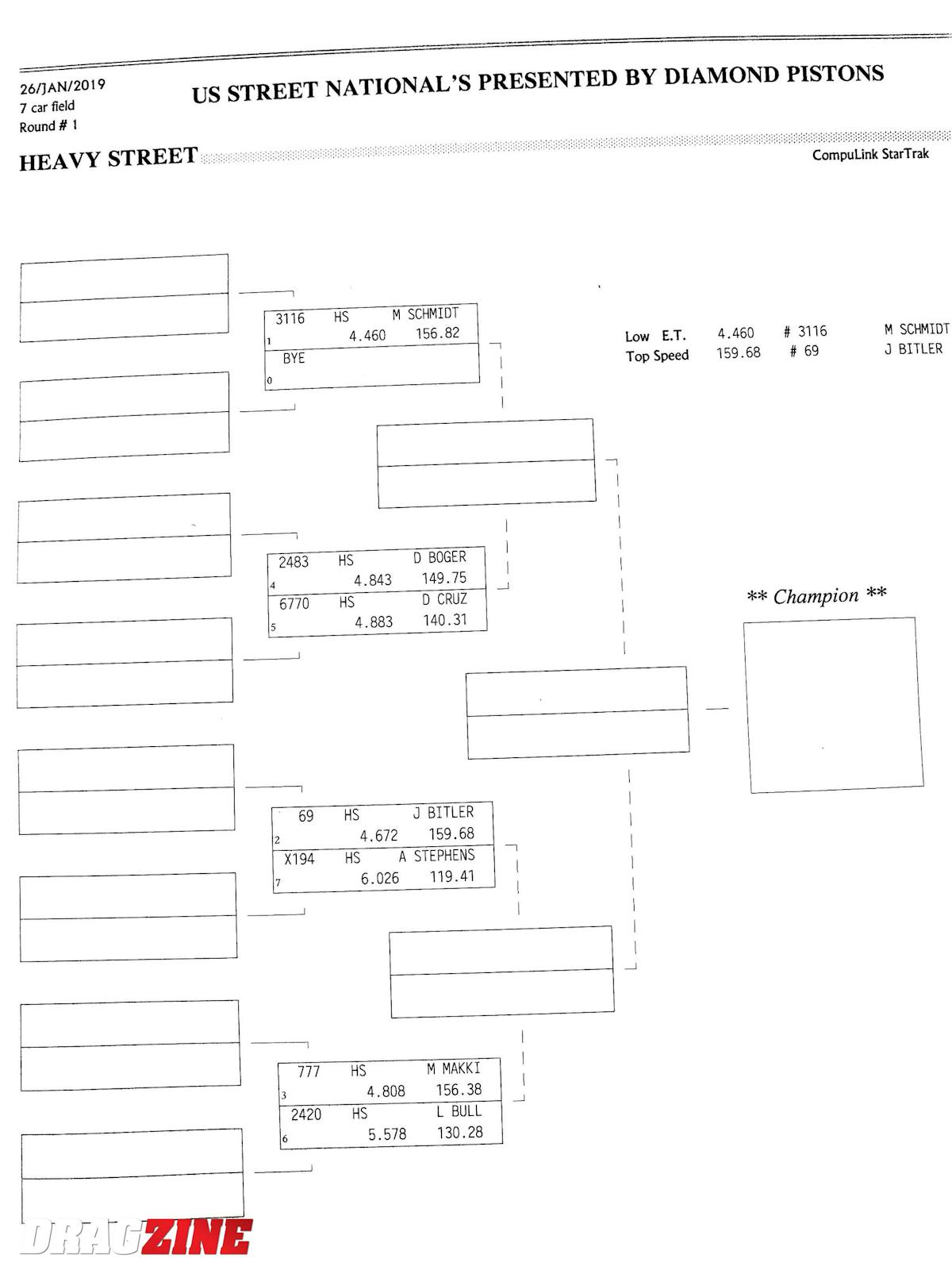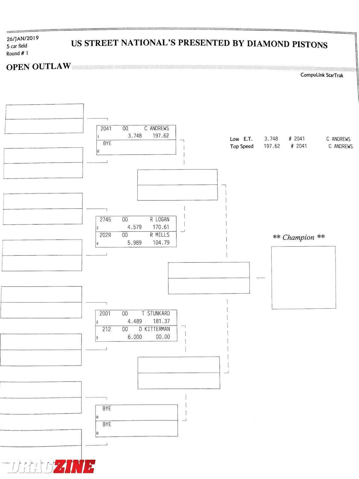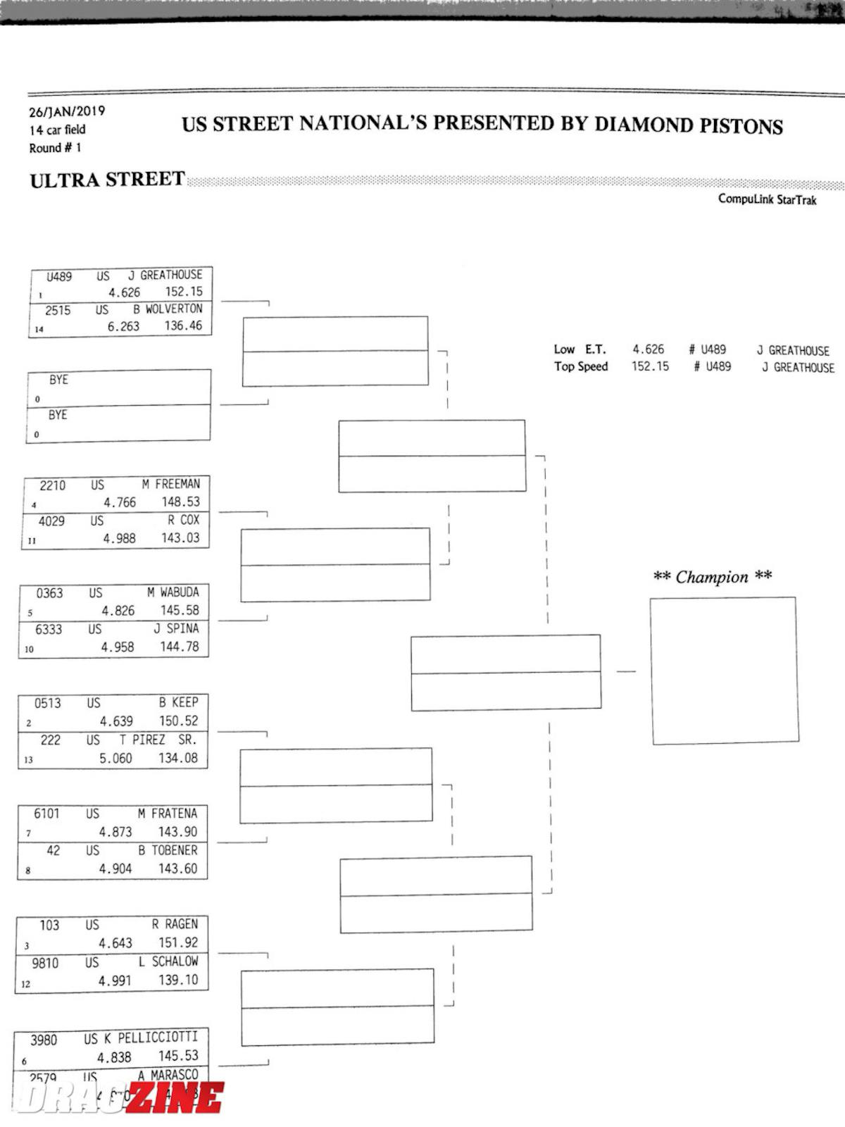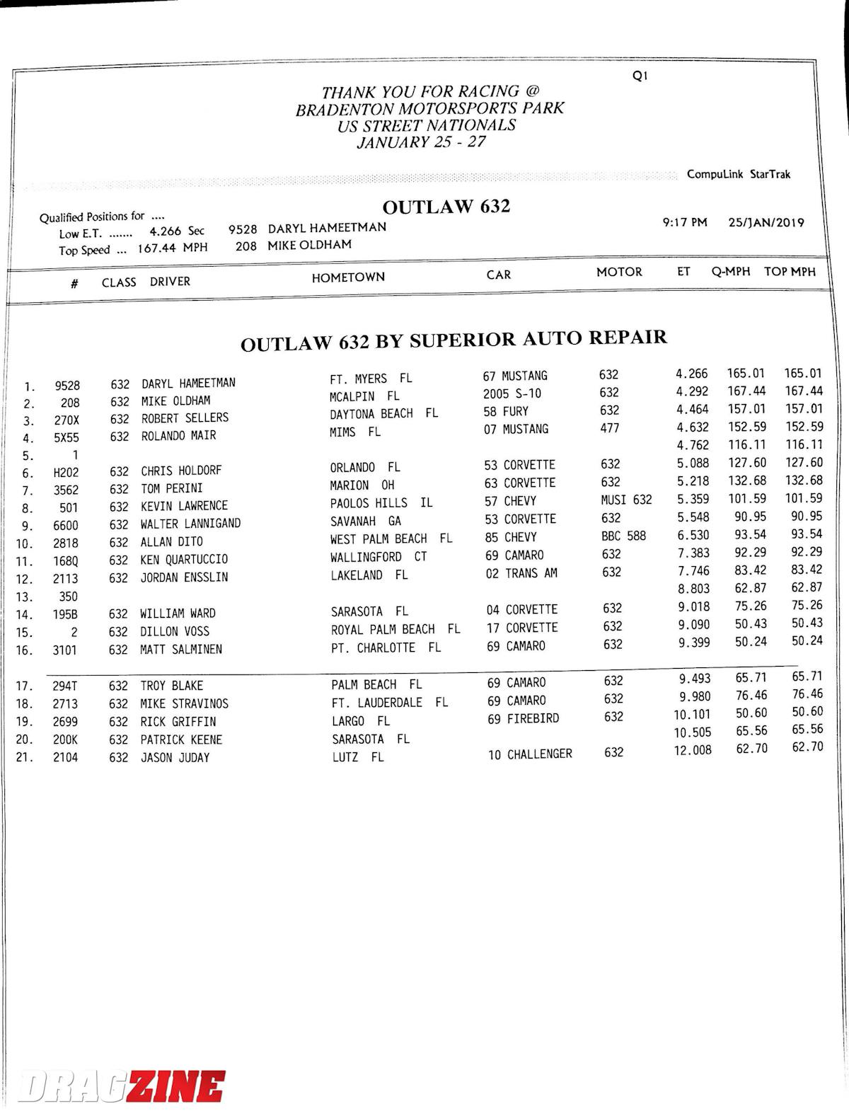 Ultra Street fared well int eh weather conditions with most of the thirteen car field making it A to B and Brian Keep leading the class with a 4.639 at 150 to earn top qualifier so far. Keep has a fresh engine from Hameetman Racing Engines and swapped to the smaller Procharger F1A 91 late last year weighing in a 3125 for 2019 after rule revisions for the new season. That makes it 75 pounds heavier overall than last season. Mike Wabuda in the near lane scored a 4.82 at 145 for his qualifying effort landing sixth of thirteen cars.Joel Greathouse landed second in Ultra Street with a 4.640 at 148 still sporting the tubo combo from last year. His team mate Rodney Ragen was just .003 off that pace landing third with Keep and the KBX team getting right to it for 2019.Mike Freeman was here testing at Runday Sunday just a couple of weeks back. If you recall he purchased Tyler Crossnoe’s car late last year but crashed at No Mercy. The incident put the team behind and the decision was made to upgrade his old car and swap things around to regroup for 2019. Freeman landed fourth with a 4.76 at 148 and has Brian Keep now assisting with tuning the car.Daryl Hameetman has top qualifier so far in Outlaw 632 with a very nice 4.26 at 165. He went the long way around to get there moving out of the groove early on the attempt. Look for more of of Hameetman tomorrow once he gets a straight run.Mike Oldham landed secomd on class with a 4.29 though it was in front of Daryl by two or three cars. Oldham has a solid two MPH better top end charge in his 2005 S-10. We wonder how much or that is aerodynamics vs horsepower??