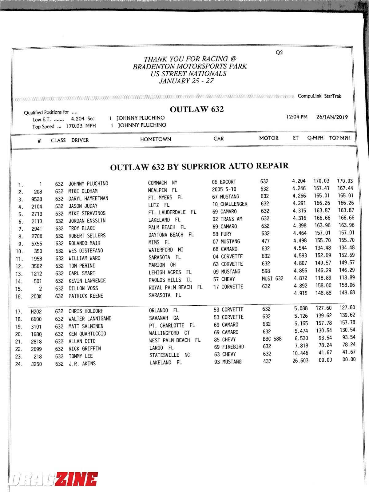 We stopped by Norman Bryson’s pit to see what is new for the team for 2019 and found he had switched to Billy Albert horsepower for the season. This is his first event racing here in Bradenton for the team who has been in the RVW game since 2015. He qualified with a 3.94 at 192 MPH this weekend and has been a best of 3.70 at Darlington. Bryson just swapped over to an EFI Technologies system and has fought various issues since getting here Tuesday for testing getting everything synced up and working together again with Jack and Bud Green assisting with the engine management tuning.Denis Lachance hails from Quebec, Canada and is another first time attendee here at the US Street Nats. Denis purchased the car from Eric Latino after competing in Top Sportsman for several years with the UDRA and PMRA in Canada, also doing some Top Sportsman racing in division 1 in the US. This event is a warm up for the team who plans a full PRDA Pro Boost season for 2019. The engine is also from Eric Latino’s program with Al Billes providing the blowers for Lachance.Johnny Pluchino is hauling the mail and dipping into the teens here this weekend in OL 632. He is the 2018 Champion record holder in PDRA, with I believe a 4.16.Dillon Voss is testing for Mountain Motor Pro Stock this weekend while entered in Pro Mod. Voss drives the car for Enoch Love based out of Richmond, Virginia with this being the team’s third race with Voss driving.The team plans a ful season with the PDRA and will attend the four NHRA events featuring the Mountain Motor class. Voss qualified with a 4.06 at 177.