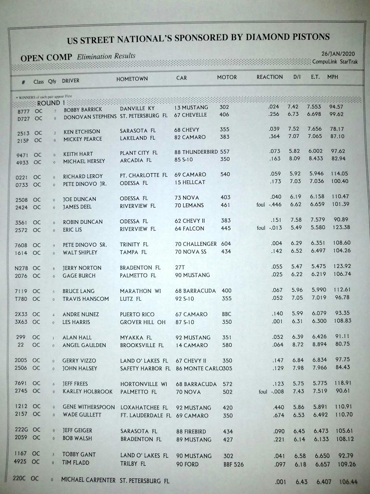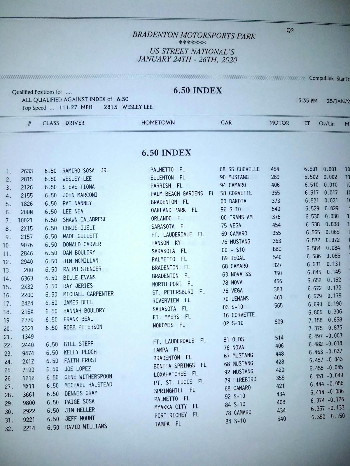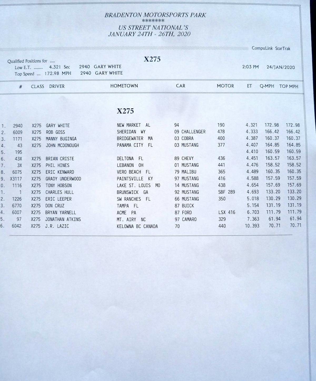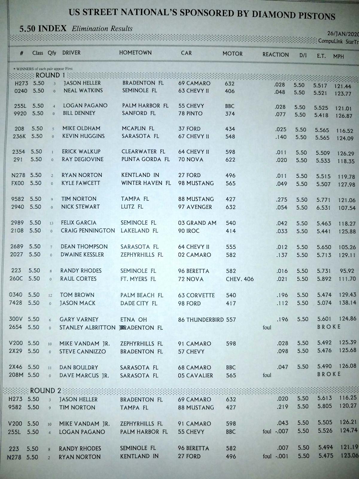 It’s another fine day in Florida for racing as we move to the final day of the 2020 US Street Nationals in Bradenton. We get started this morning with Open Comp and Jr. Dragsters before moving to the Index classes and heads up racing towards 11 AM.