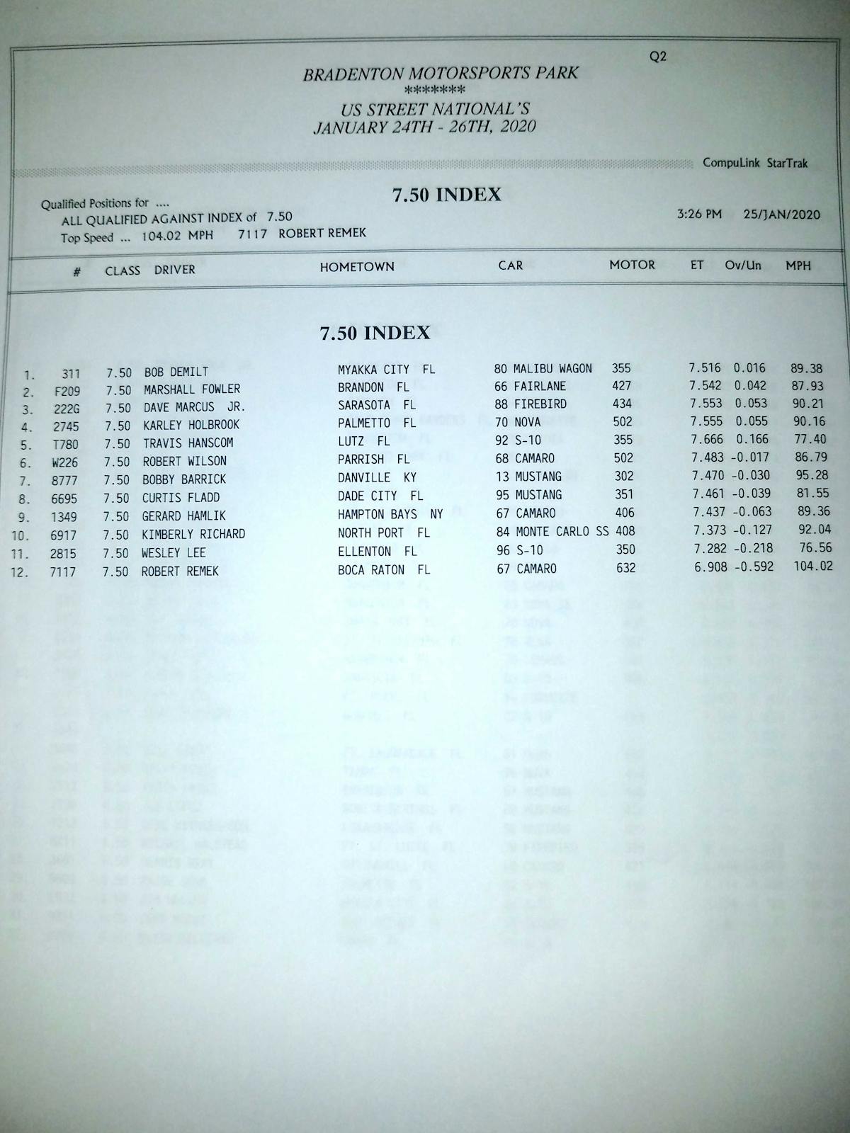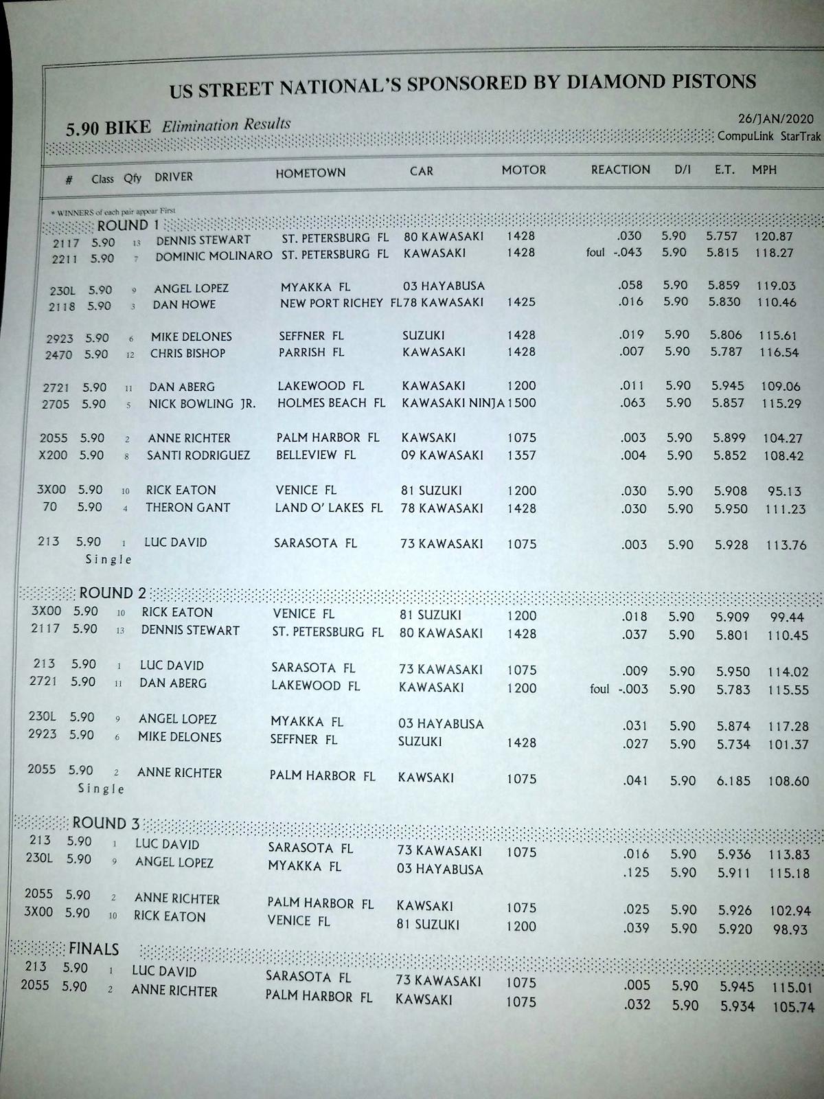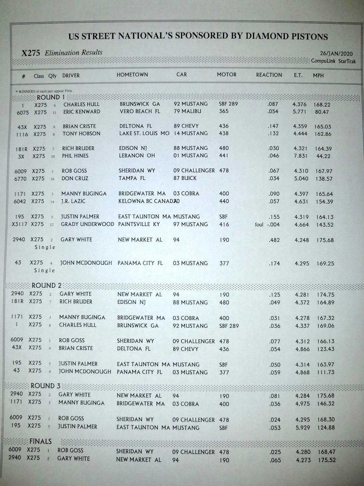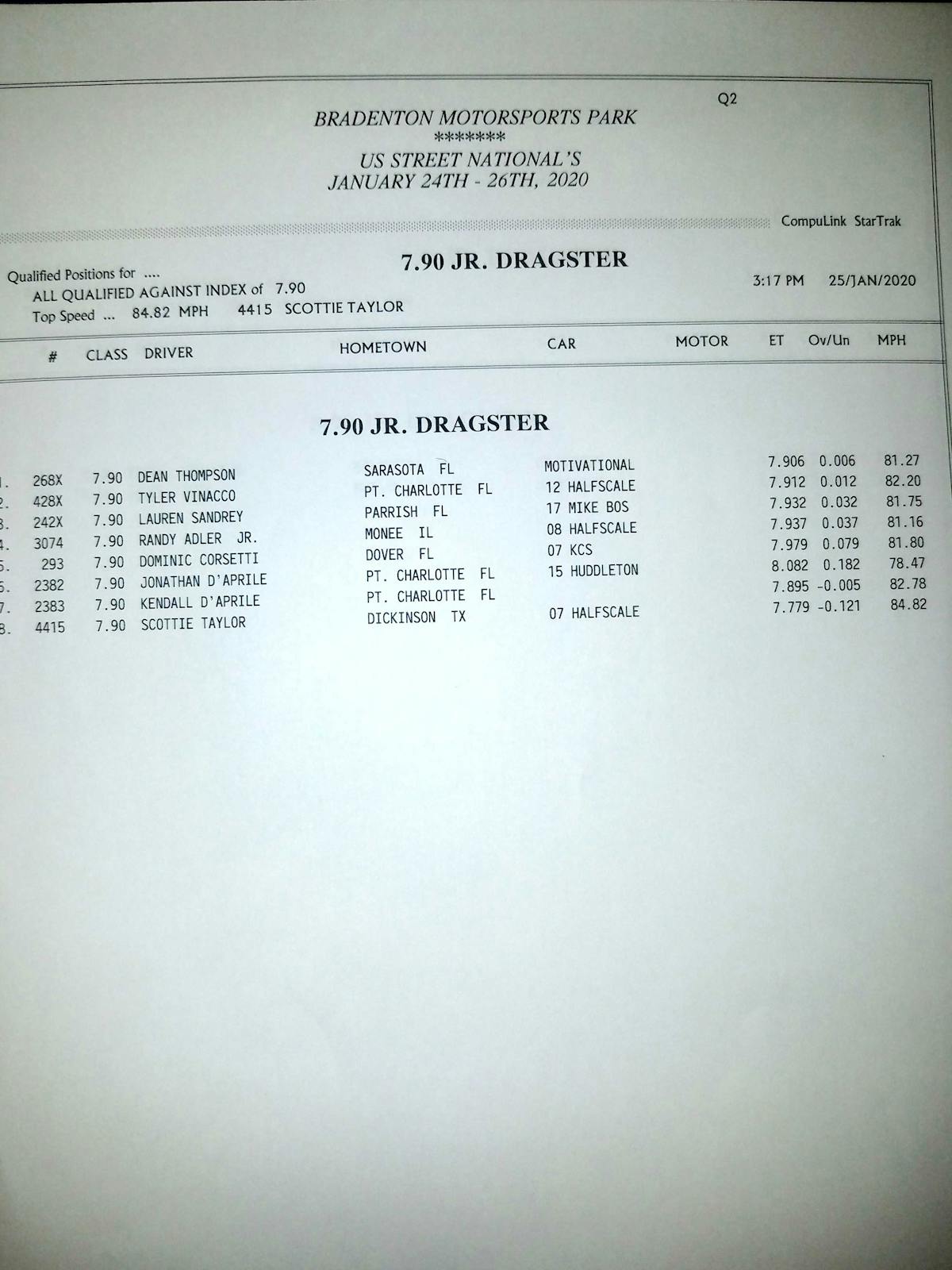 It’s another fine day in Florida for racing as we move to the final day of the 2020 US Street Nationals in Bradenton. We get started this morning with Open Comp and Jr. Dragsters before moving to the Index classes and heads up racing towards 11 AM.