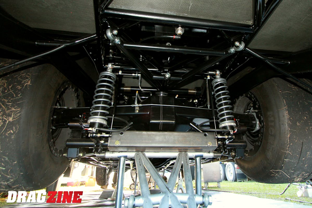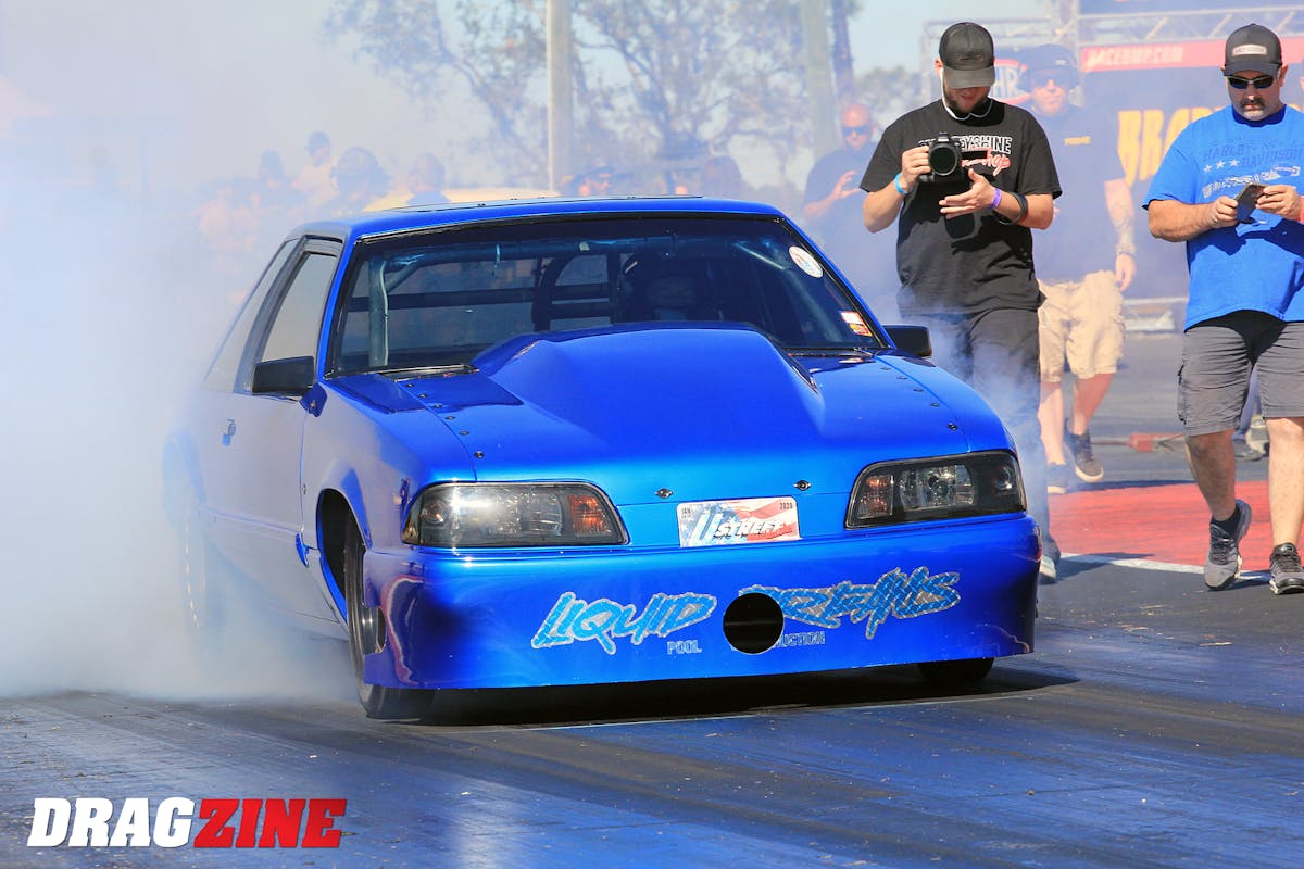 The build has been about a three year process in an effort to be a little different from the heard. The car has been converted to a triangulated 4 link, Fox body Mustang style rear suspension. They have not made a full pass yet while working the bugs out f the new combo but qualified so far with a 4.83 at 127 lifting at 3.8 seconds in the run and have a new pulley coming this morning via UPS to increase the boost. Teh crew from left to right is Darryl from JS Powersports, J.R. Lazic and his father Roy Lazic.