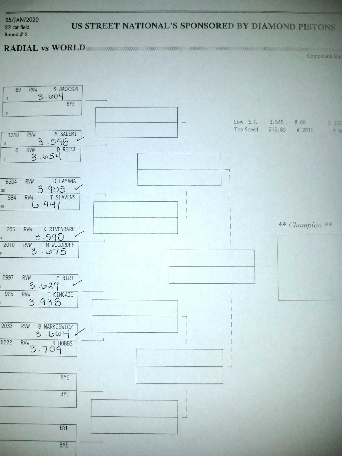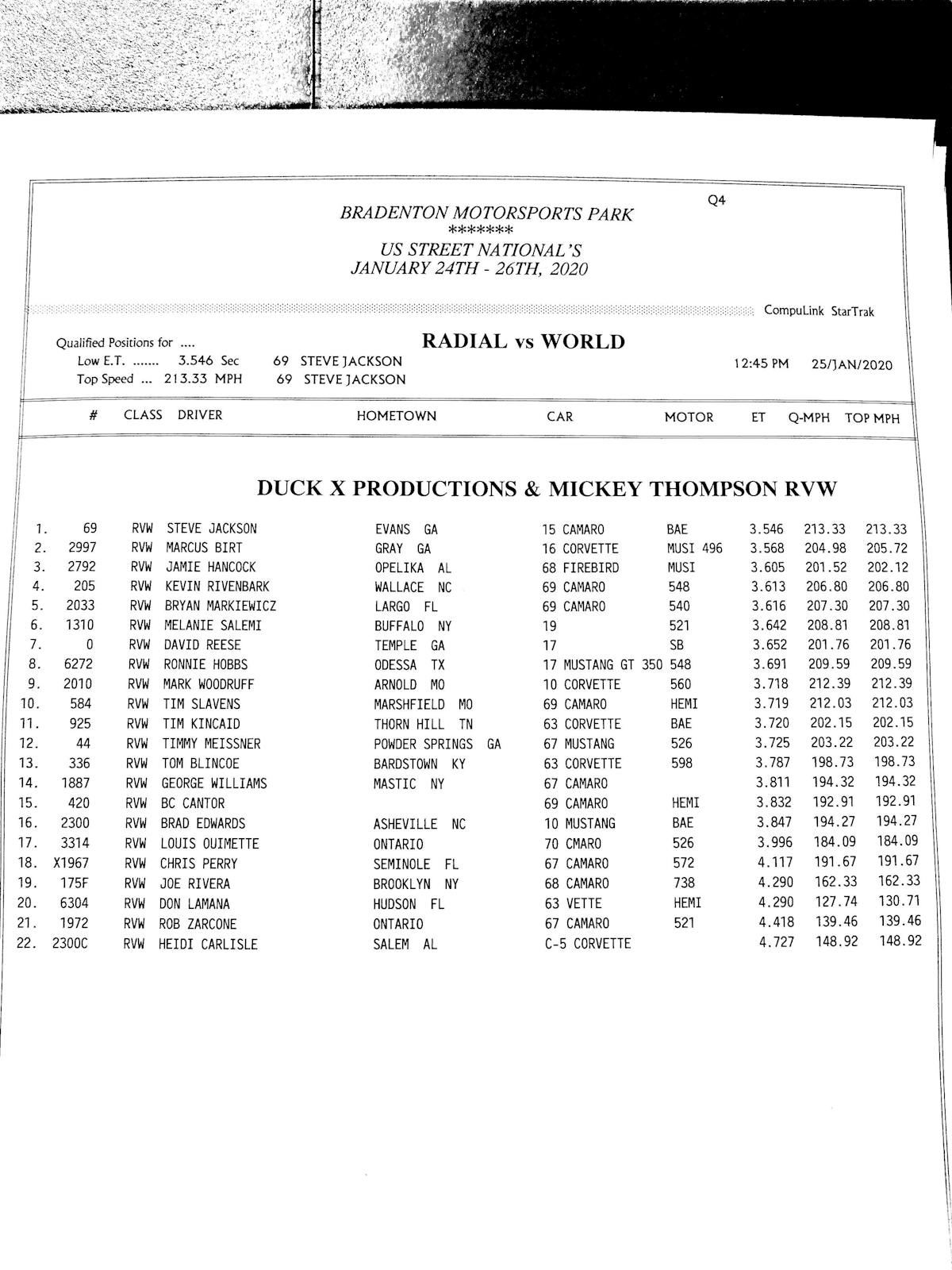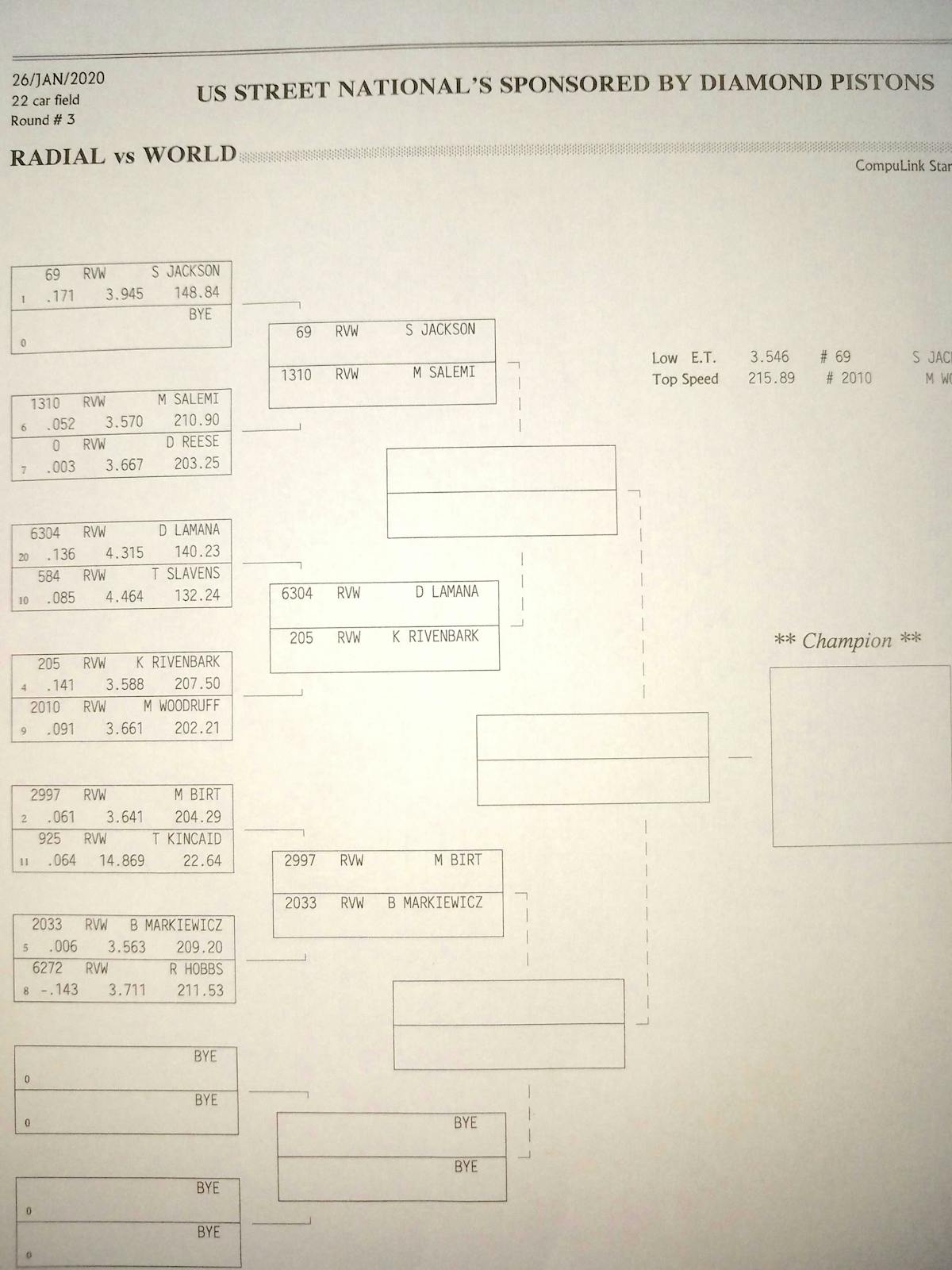 Radial vs the World was simply on fire this weekend with no less than nine runs in the 3.50 during eliminations by four different cars, Steve Jackson, Kevin Rivenbark, Bryan Markiewicz and Melanie Salemi, who, while paired with Jackson in round three set the record for quickest side by side pair in Drag Radial history, Jackson with a 3.548 at 213 to Melanie’s 3.574 at 210. “Marcus is an awesome driver, we went .005, .008 on the tree in the final and were dead locked beside each other at the 330′, it was a good drag race and a great way to start 2020…” Jackson said after the race.