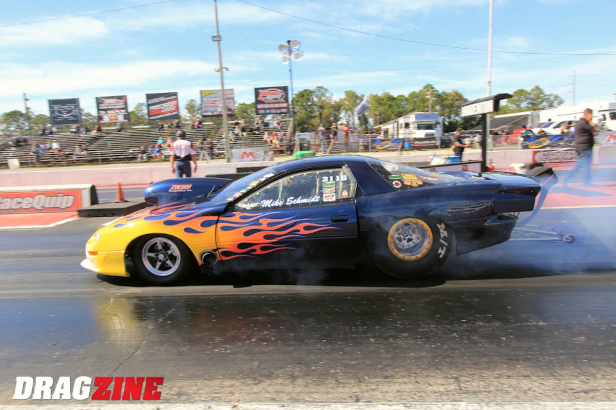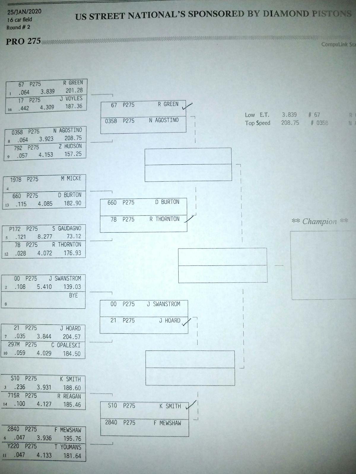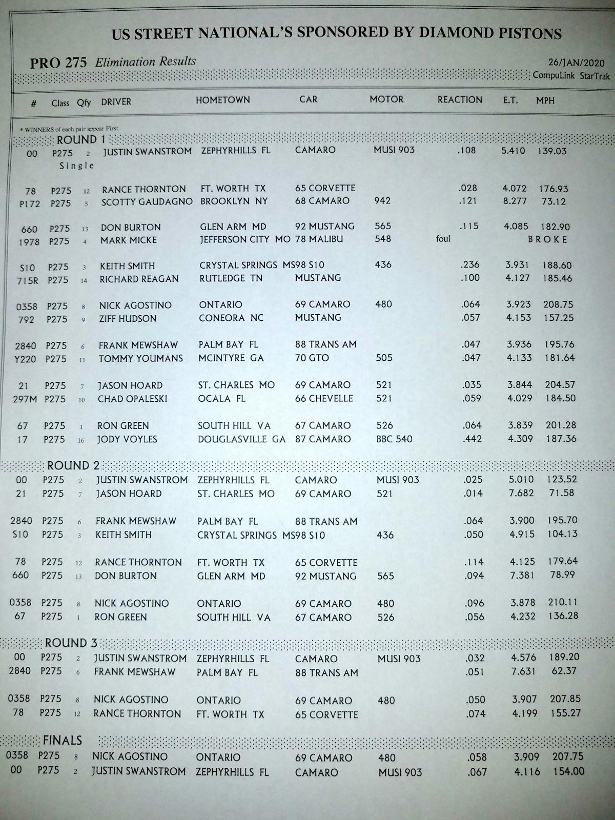 Nick Agostino has joined the ranks of Pro 275 for 2020 on the “Get in where you fit in” theory of heads up racing. His Camaro was built three years ago and set up for Outlaw 10.5 and Radial vs the World using a Vizner Engine Development small block Chevy based engine, now on version 3.0. “You know over the last three years as the weights have come down in RVW and things have changes in the class,now I’m not saying I can’t compete there but I’m telling you straight up that class ran straight over us and I’m almost two hundred pounds overweight now. So when Mark Micke said he might move over to Pro 275 I looked at the rules. When you compare the rules, the direct flip over from Outlaw 10.5 is Pro 275 now. So that is where we are. We came here untested on the tire and have played it safe with the tune ups learning how it works and how to bring the power on.” The team did just that running a best of 3.87 at 210 MPH during elimination to get by his long time friend, top qualifier and current record holder (3.839) Ron Green in round two.