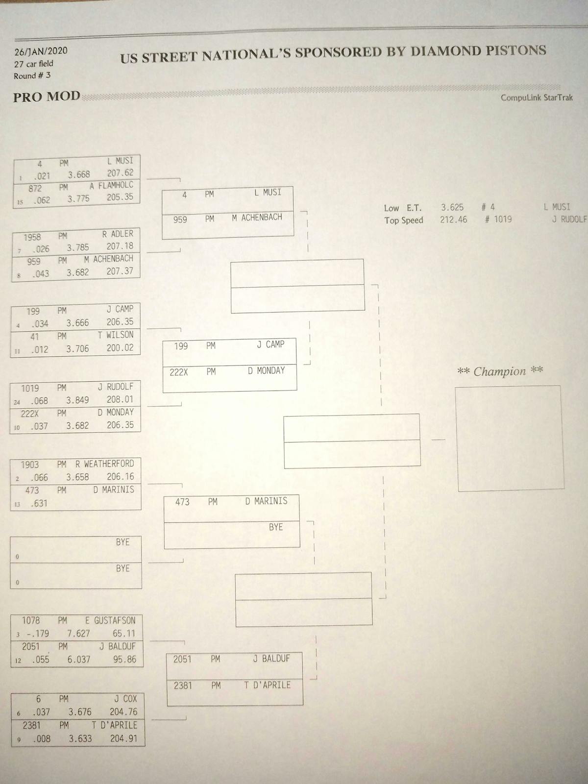 Pro Mod featured some tough racing this weekend with Lizzy Musi running the table on her way to victory to start off the 2020 season. She put up a string of 3.60’s and scored a perfect reaction against Johnny Camp in the semi final round when she needed it with Camp scoring a 3.68 at 205 to her winner 3.70. Dean Marinis was driving for Chad Green in the Pat Musi powered Corvette and made it to the semis from thirteenth position in the field to meet with Tommy D’Aprile in the Caruso backed Camaro where D’Aprile took a decisive round win with a .011 reaction on 3.66 at 203 that was good for lane choice. In the final he would again take the starting line advantage but slowed to a 3.70, with Musi right there running a 3.65 at 206 the Frank Brando backed team put up there best run of eliminations to earn a hard fought win. “She had to race every round and we knew we had to step it up for Tommy, we had to be careful when the track temp got up but we knew we could throw the coals to it in the final and got the win.” Pat Musi offered after it was all over.