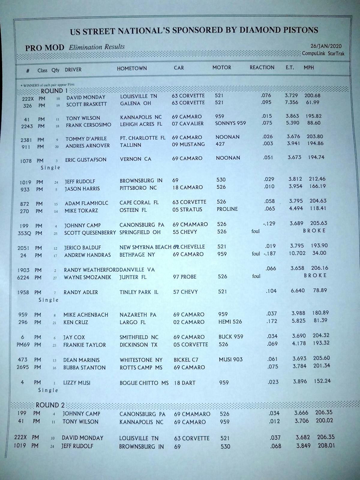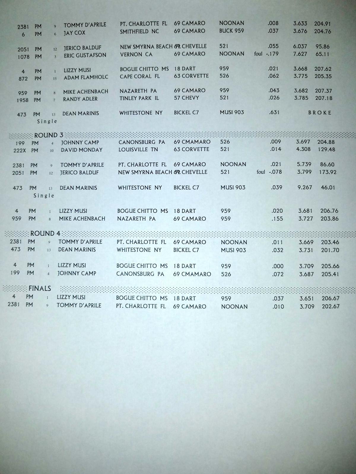 “We are gonna run whatever PDRA races that don’t overlap with the No Prep Kings and I have about twenty races to go to myself with Chad Green running NHRA with his car…” Lizzy told us. “..We struggled during qualifying and put another engine in the car to get things sorted out. We use this race for testing and were trying stuff out and collecting data but struggled in the day time, it took us a while to figure what the car wanted here. I’m just glad to get a win with this car, it’s actually the first win with this car. I’m so excited for 2020, we have a great crew and we have DeanMarinis helping and Tommy Franklin was here this weekend too helping. None os this would be possible without the crew and Frank Brando who gives me the opportunity to drive this car, he has been with us for a long time and is going to be really happy for this won.”