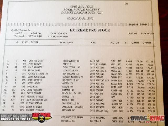 Top Sportsman Lizzy Musi ran a 4.277 at 170 to put her in fifth position in her class so farTop Sportsman Jerry Holt blasts down the track running a 4.152 at 175 in his 1968 McAmis CamaroPro Mod Jeffrey Cummins Jr ran a 4.005 at 183 in his 1968 CamaroPro Mod Jeff Naiser local to Houston, Texas rockets down the track running a 3.895 at 189 to making him the number two qualifier.Pro Mod Adam Flamhoc is a newcomer to the ADRL. His team came all the way from Malmoe, Sweden. He ran a 4.080 at 183Extreme Pro Stock Cale Aronson moved from seventh place qualifier to third place with his great run of 4.088 at 176Extreme Pro Stock Cary Goforth lands the number one qualifying spot by running a 4.069 at 177SuperCar Showdown Bo Butner runs a 5.926 at 118 in his 2012 CobraJet MustangExtreme Ten Five Todd Moyer runs a respectable 4.020 at 202.76 to put him in the number three qualifying postition.Extreme Ten Five Dennis Sugrue got down the track after having compications in the first qualifying round. He ran a 4.164 at 188Pro Nitrous Jim Laurita runs a 3.942 at 191 in his 1970 CamaroPro Nitrous John Decerbo rockets down the track in his 1968 Camaro running an impressive 3.881 at 190 to put him in the second qualifying position.Pro Extreme Joey Martin runs a 3.822 at 197 in his 1955 Nomad aptly named "LOWMAD"Pro Extreme Randell Reid runs a 4.002 at 192 in his 1957 Chevy Belair