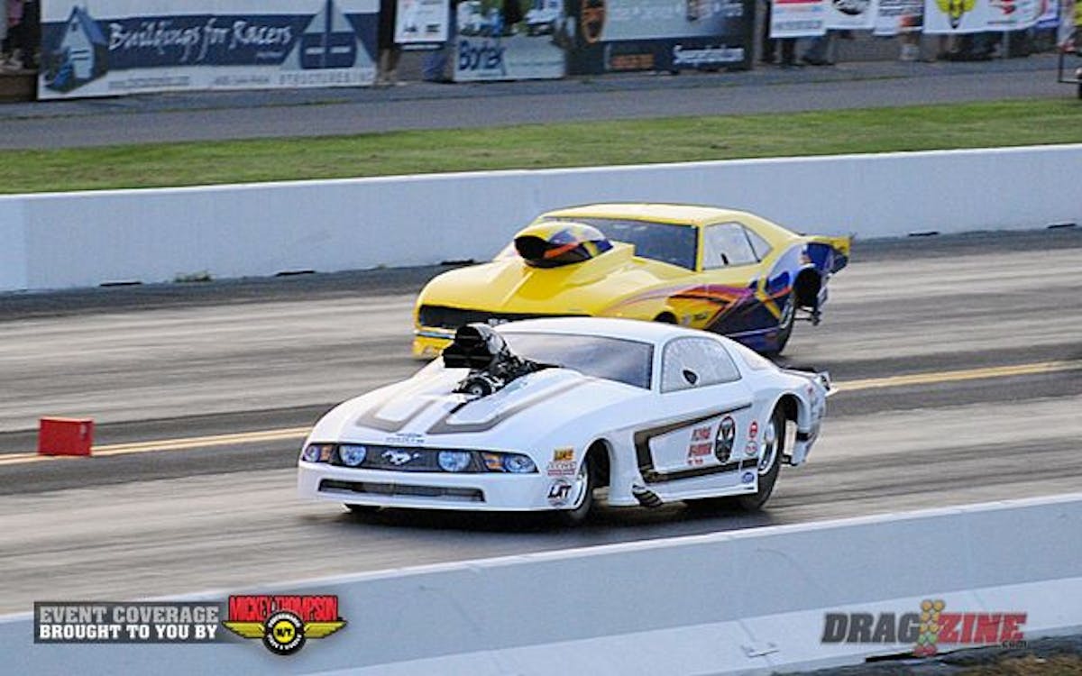 Stan Allen's black Camaro took the top spot in Pro Nitrous with a 3.911/192.74 pass, In the far lane is Tommy Franklin, who is working on a setup after a four year absence from a bad crash at MIR.