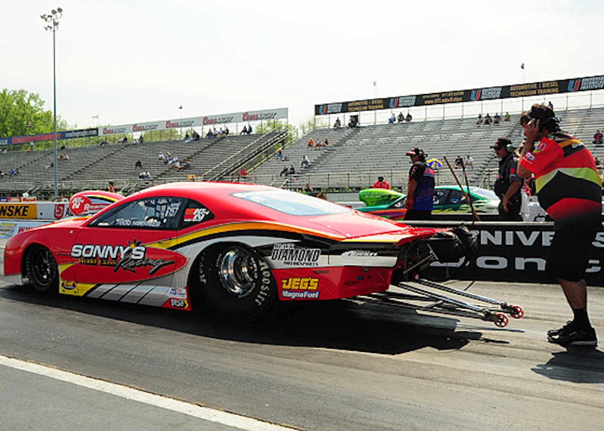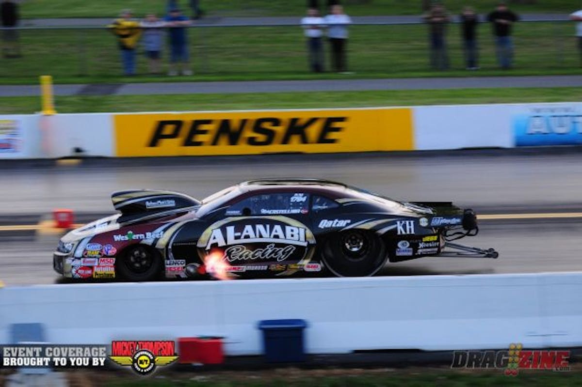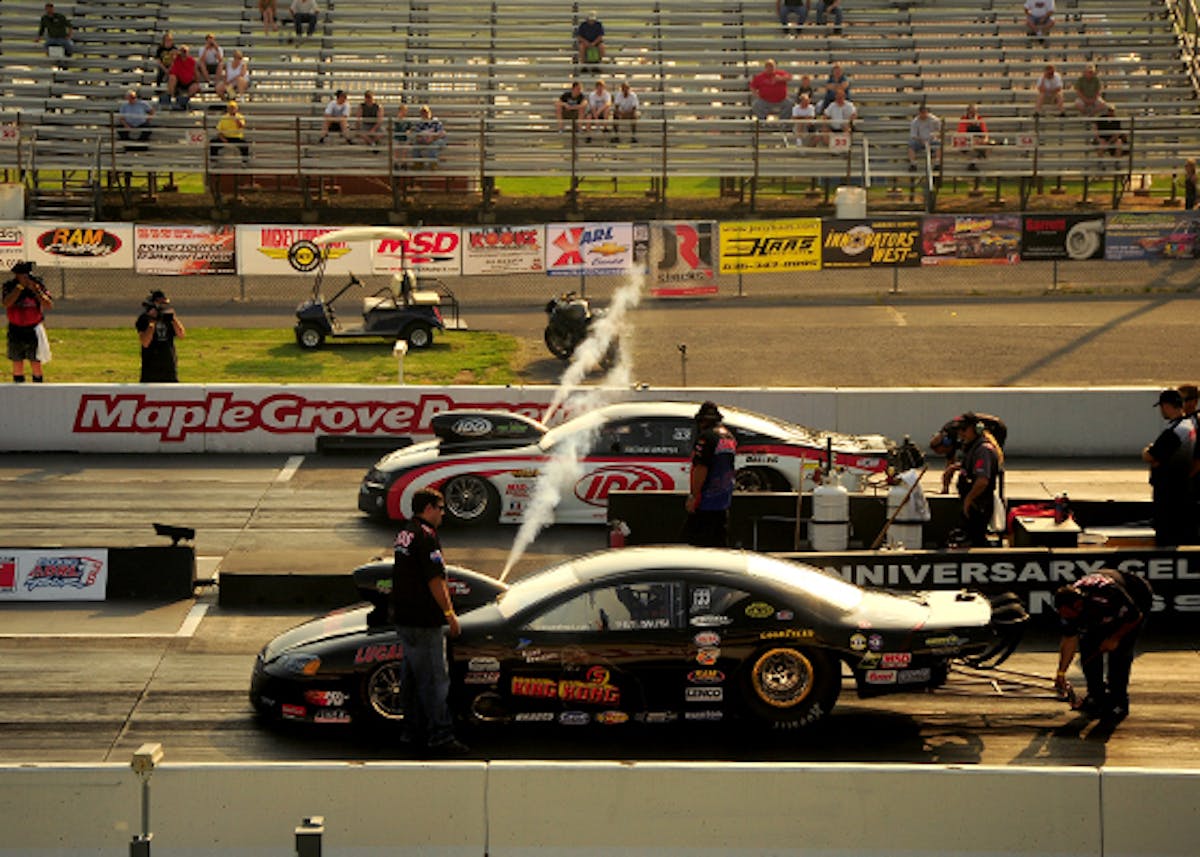 Pat Musi and Rickie Smith purge their nitrous systems before Q2. Musi is currently No.3 and Smith sits No. 7 in the Pro Mod field.